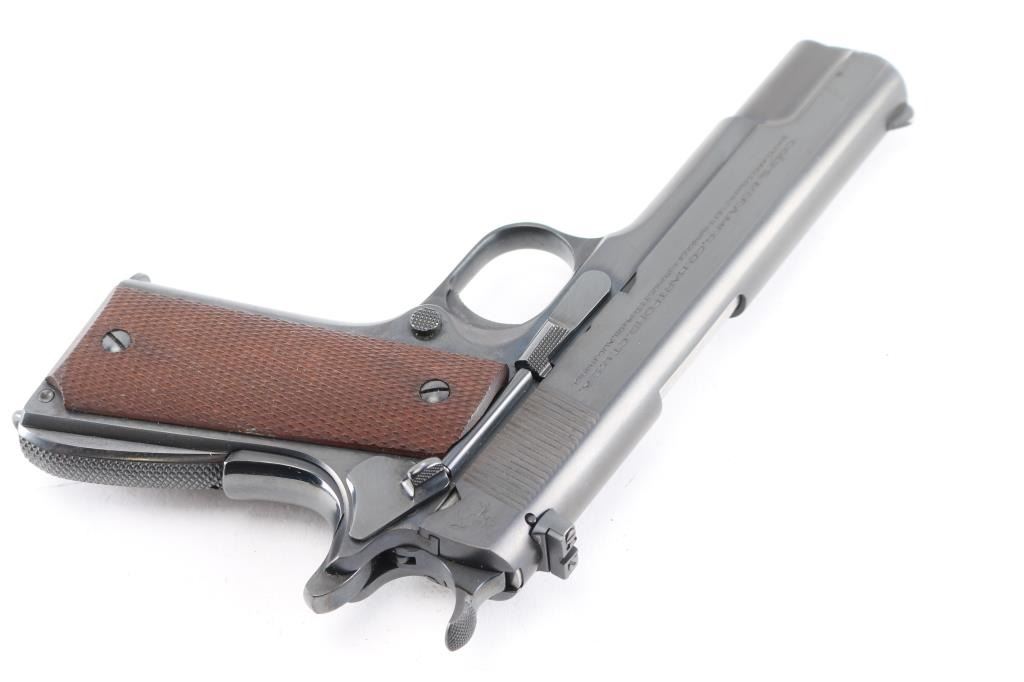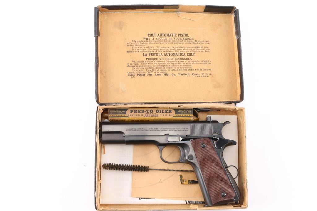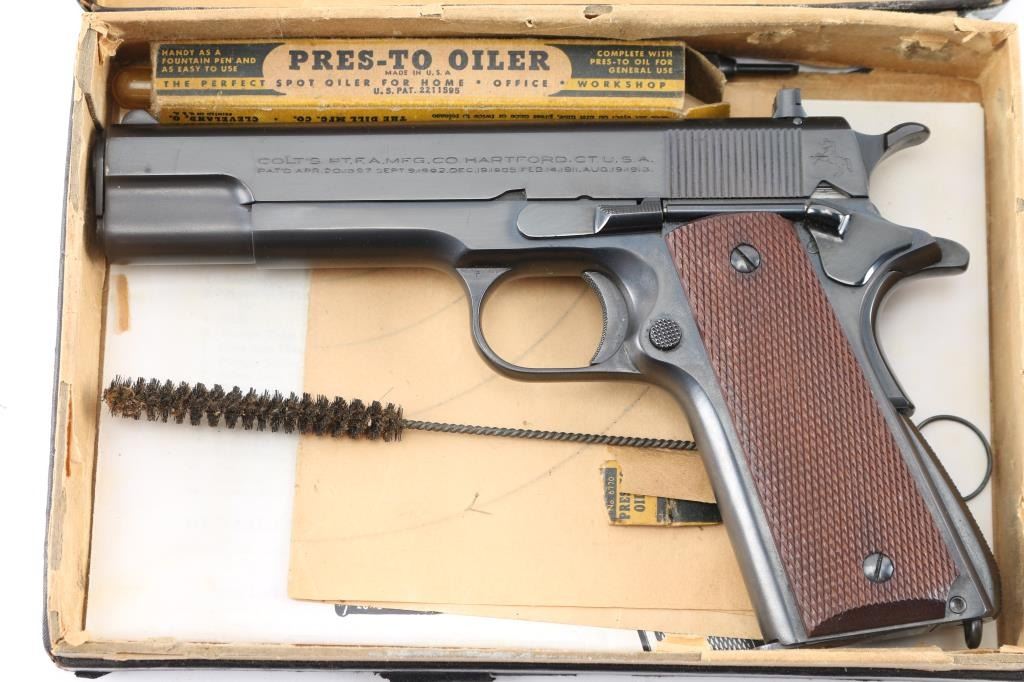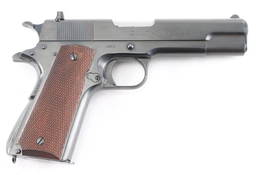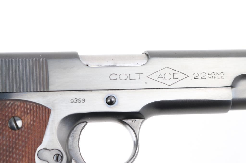 Stunning restored 1938 vintage single action semi-automatic 1911A1 pattern pistol chambered in .22 Long Rifle. Features blued finish, 4-3/4" barrel, fixed blade front & adjustable rear sight, manual safety, grip safety, lanyard ring at butt, checkered wood grips, knurled, arched mainspring housing. "P" and smaller triangle "P" on on left triggerguard and "77" stamped on the right. Bore is excellent. Retains 99% reblue finish with a couple of minor scratches. All markings are sharp with crisp edges, including Rampant Colt. Metal surfaces do not show any rippling on flats, and edges are straight without any noticeable rounding. Replaced grips are excellent. Includes one Colt/Ace marked magazine, original factory dark blue cardboard box with Colt Ace label, test target, fired by J. Molloy with matching serial number, vintage "Pres-To-Oiler in original box, cleaning brush, and manual. Matching serial number penciled on the bottom of box. The lid of the box is taped with black tape around the edges, otherwise in pretty good shape.