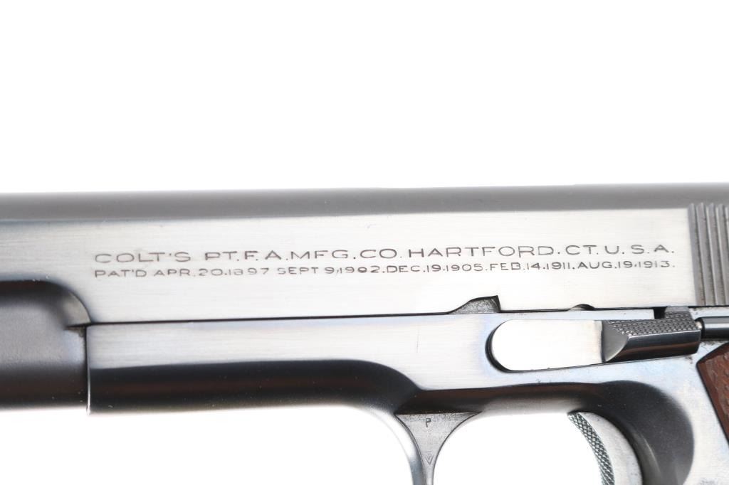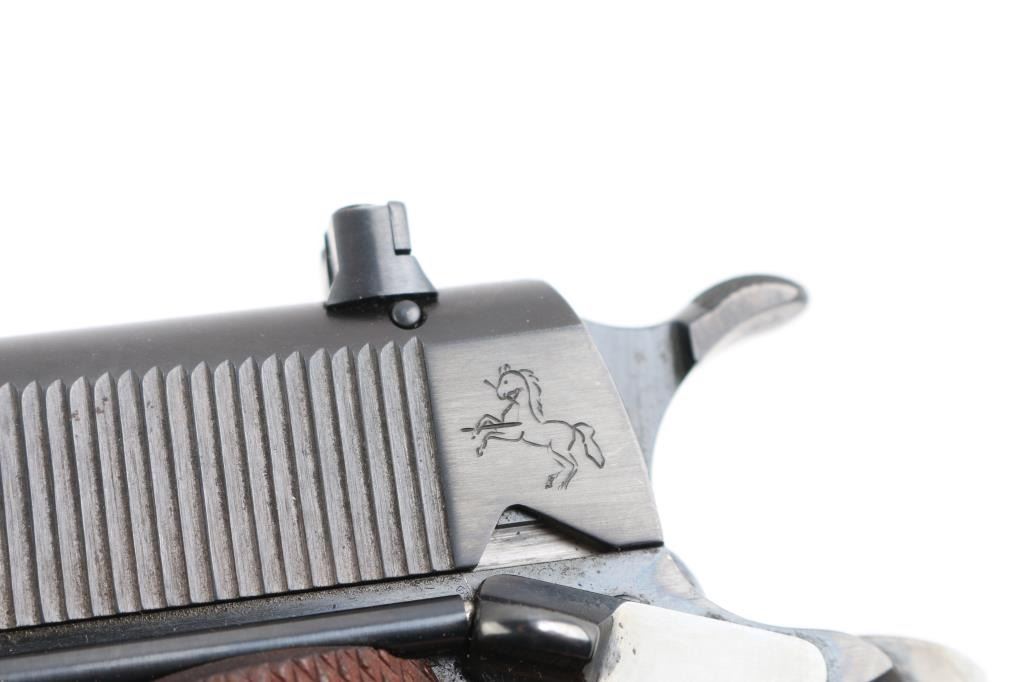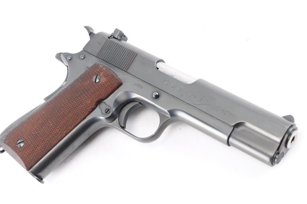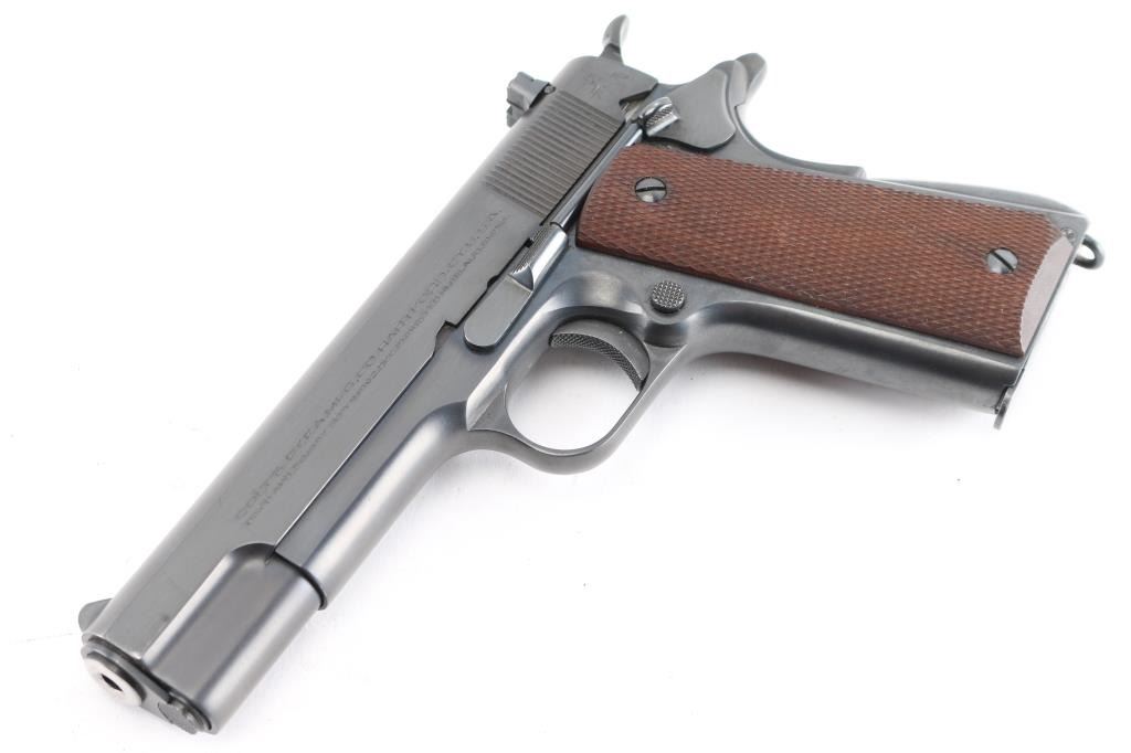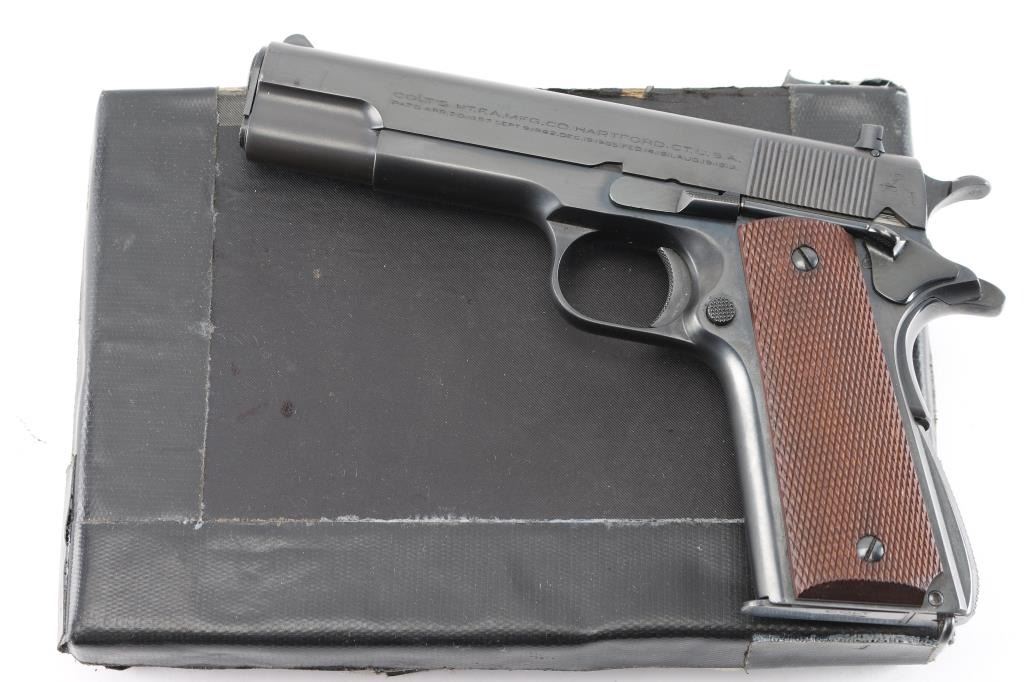 Stunning restored 1938 vintage single action semi-automatic 1911A1 pattern pistol chambered in .22 Long Rifle. Features blued finish, 4-3/4" barrel, fixed blade front & adjustable rear sight, manual safety, grip safety, lanyard ring at butt, checkered wood grips, knurled, arched mainspring housing. "P" and smaller triangle "P" on on left triggerguard and "77" stamped on the right. Bore is excellent. Retains 99% reblue finish with a couple of minor scratches. All markings are sharp with crisp edges, including Rampant Colt. Metal surfaces do not show any rippling on flats, and edges are straight without any noticeable rounding. Replaced grips are excellent. Includes one Colt/Ace marked magazine, original factory dark blue cardboard box with Colt Ace label, test target, fired by J. Molloy with matching serial number, vintage "Pres-To-Oiler in original box, cleaning brush, and manual. Matching serial number penciled on the bottom of box. The lid of the box is taped with black tape around the edges, otherwise in pretty good shape.