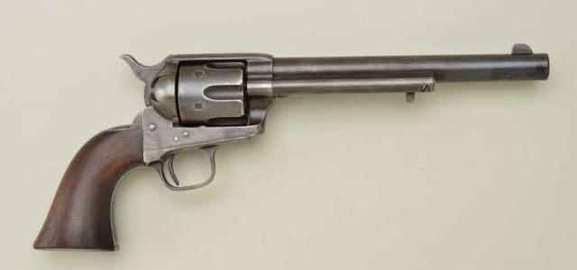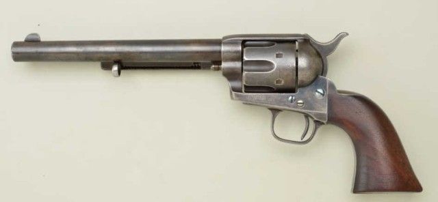 Colt Ainsworth inspected U.S. Cavalry SAA revolver, .45 cal., 7-1/2” barrel, blue and case hardened finish, wood grips, #11532. This gun is in overall very good condition showing scattered traces of muted blue withconsiderable plum brown patina and some scattered light pin prick pitting at firing areas; correct italics barrel address; all matching visible serial numbers including the barrel numbered under the ejector housingthat is not numbered; good to very good bore, crisp action, sharp markings, very good to fine grips with a very clear inspector’s cartouche on the left grip (OWA) and “A” and “P” proofs on the barrel, cylinder, “A” onbackstrap and trigger guard; a very nice Ainsworth SAA with great grips. Est.: $5,000-$10,000.