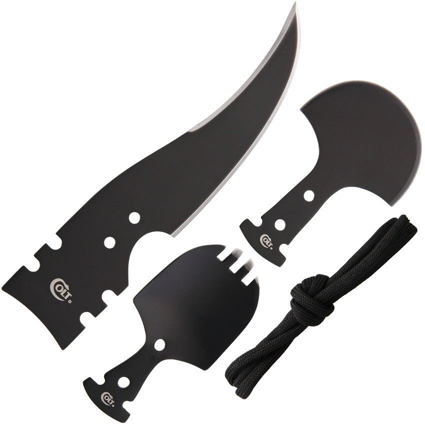 Includes 6" hunting blade, ulu head, spork head and starter length of paracord. Black finish stainless construction.