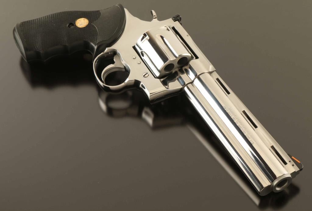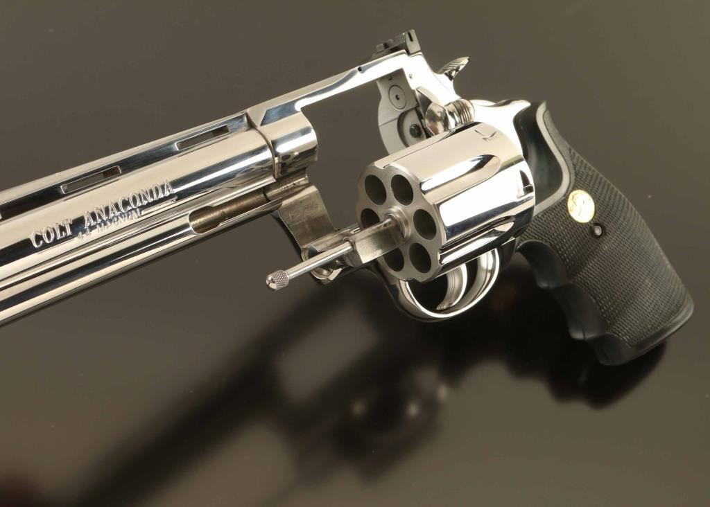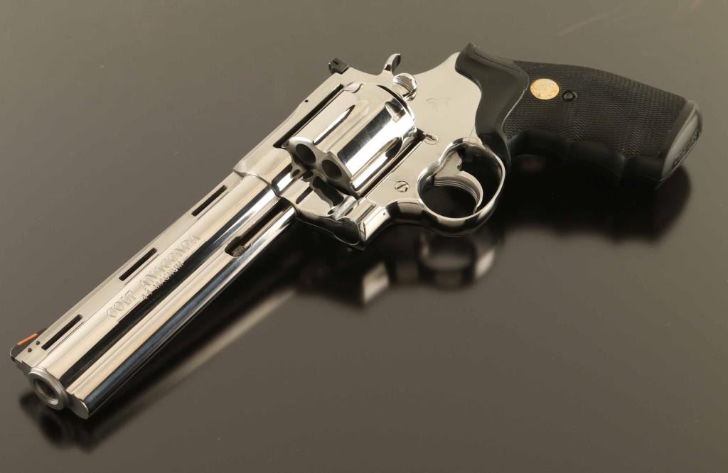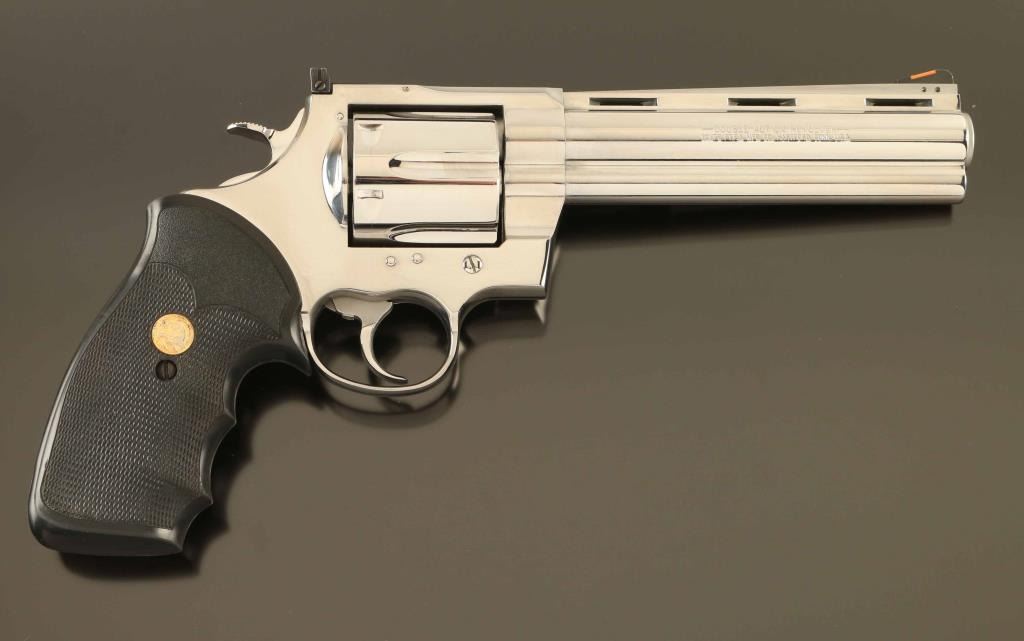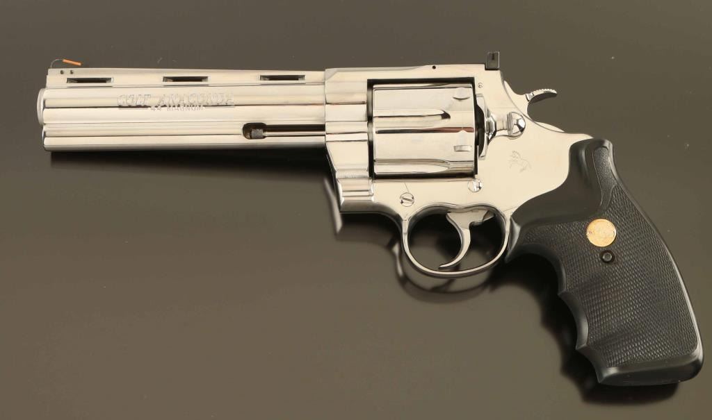 Premium large frame stainless steel double action revolver chambered in .44 Magnum, manufactured circa 1991. Features a bright polish finish, 6" vent ribbed barrel with full underlug, pinned ramp front sight with orange insert, fully adjustable rear sight with white outlined square notch, fluted six-shot cylinder, partially serrated trigger, flat top frame, serrated wide hammer spur and one-piece Pachmayr Presentation checkered black rubber wrap-around finger groove grip with gold Colt medallions. Includes a factory hard case with documents and hang tag. Revolver exhibits a light drag line on the cylinder and only minor handling marks. Action is super smooth with very good lock-up, the bore is pristine, and the rubber grips are fine. Condition is NRA Excellent in case. ***Modern Firearm***