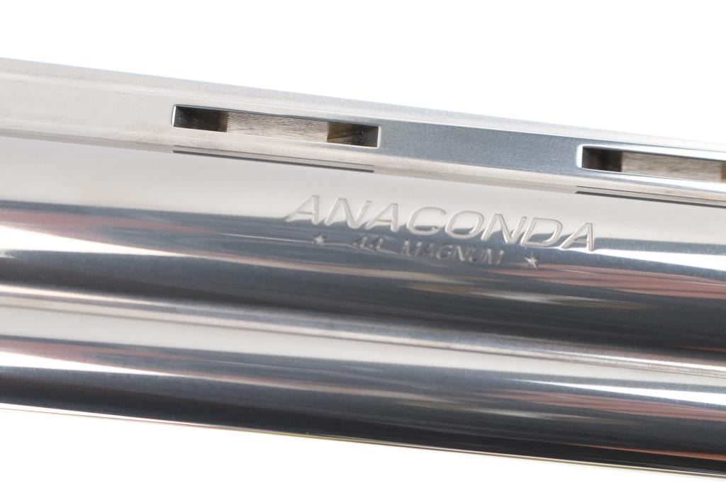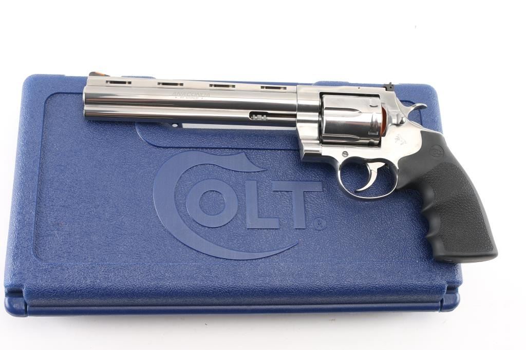 Premium large frame stainless steel double action revolver chambered in .44 Magnum. Features a bright polish finish, 8" vent ribbed barrel with full underlug, pinned ramp front sight with orange insert, fully adjustable rear sight with square notch, fluted six-shot cylinder, partially serrated trigger, flat top frame, serrated wide hammer spur and one-piece pebble grained black rubber wrap-around finger groove grip. Revolver exhibits a light drag line on the cylinder and only minor handling marks. Action is super smooth with very good lock-up, the bore is pristine, and the rubber grips are fine. Includes a factory hard case with documents. Condition is NRA Excellent *** Modern Firearm ***