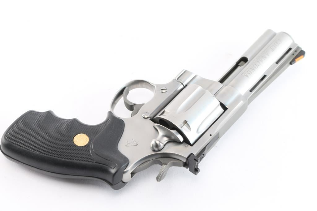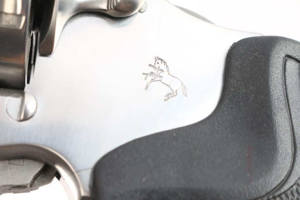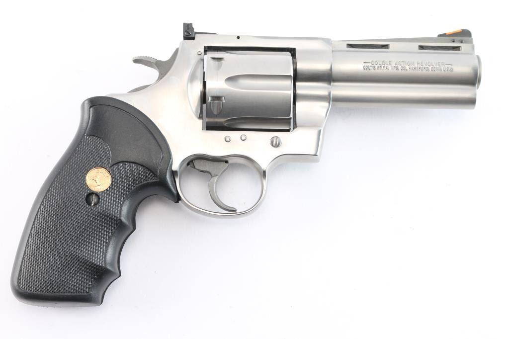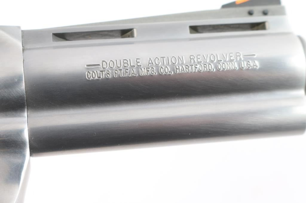 American made premium large frame stainless steel double action revolver chambered in .45 Long Colt, manufactured circa 1994 in Hartford, CT. Revolver features a polished stainless finish, 4" vent ribbed barrel, shrouded ejector rod, full underlug, pinned ramp front sight with orange insert, micrometer adjustable square notch rear sight with white outline, fluted six-shot cylinder, partially serrated wide curved trigger, flat top frame, frame mounted firing pin, transfer bar safety, serrated wide hammer spur, and two-piece checkered black rubber finger groove grips with gold-colored colt medallions. Revolver's original stainless finish retained is approximately 99% with only superficial scratches, and a light drag line on the cylinder. Metal displays no rust or deformation. Action is super smooth and crisp with a very good lock-up. The bore is bright with strong rifling, and the cylinder chambers are also excellent. Barrel and chambers need to be cleaned. The rubber grips are excellent.