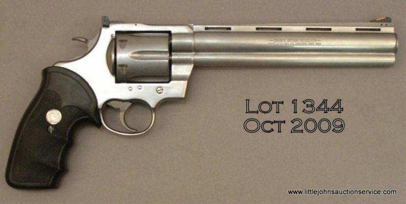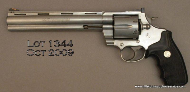 Colt Anaconda DA revolver, .44 Magnum cal., 8” ventilated rib barrel, stainless steel, combat Colt medallion hard rubber grips, #MM22623. This gun is in overall excellent condition showing a fine bore, crisp action, sharp markings, finegrips and is accompanied by a Colt blue hard plastic carry case (missing handle). Est.: $400-$800.