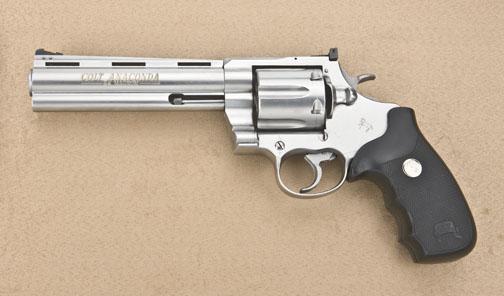 Colt Anaconda Model DA revolver with factory blue plastic carry case and instruction, .44 Magnum cal., 6” ventilated rib barrel, stainless steel, checkered Colt medallion finger groove black rubber grips, #MM89599.This gun is in overall excellent condition with a fine bore, crisp action, sharp markings and very good grips showing a small blemish on the butt of the right grip. Est.: $350-$650.