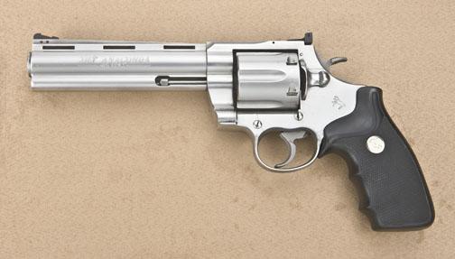 Colt Anaconda Model DA stainless steel revolver with Colt factory blue plastic carry case, .45 Colt cal., 6” ventilated rib barrel, finger groove combat Colt medallion checkered rubber grips, #MM64297. This gun is in overall fine condition with a very good to fine bore, crisp action and markings, fine grips, white outline adjustable rear sight and red insert front sight. Est.: $300-$600.