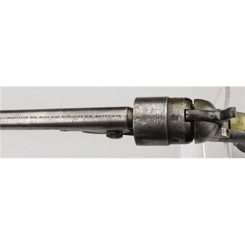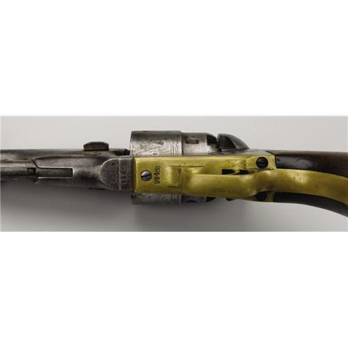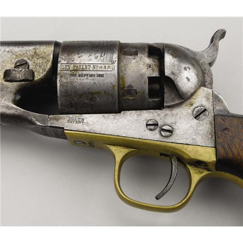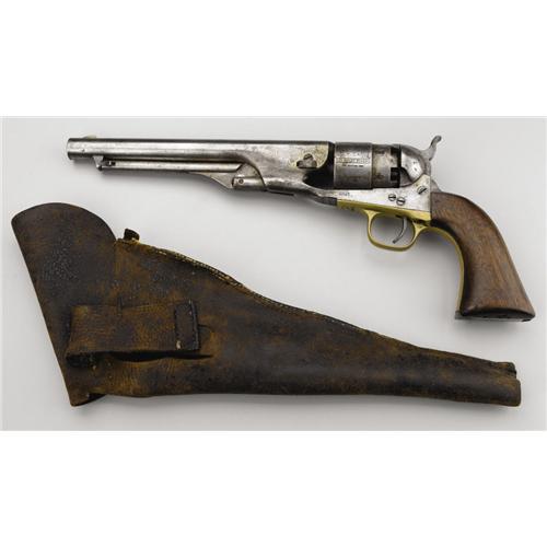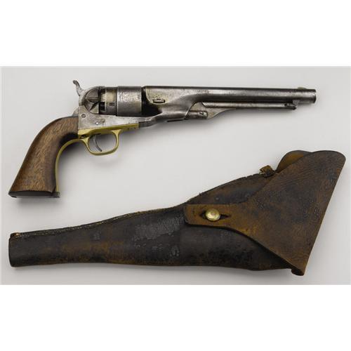 <B>Colt Army Model 1860 and Holster.</B></I> This .44 caliber revolver, serial number 98452, features an 8” round barrel, 6-shot cylinder, loading lever and plunger, and back strap, all of iron. The trigger guard, front strap, and blade front strap are brass. The serial number appears on the barrel lug, frame, and on trigger guard flat. Wedge could not be removed. Cylinder is marked “Colt's Patent No. 8452” over “Pat. Sept 10th 1860” on circumference. Left side of frame marked “Colt's Patent” in 2 lines. Cylinder scene is present but faint. There is a “W” stamped on cylinder between a set of nipples and on frame near wedge screw. Top of barrel marked “Address Col. Sam'l Colt, New York, U. S. America”. <BR><BR><B>Condition:</B></I> Fair. Finish on iron parts is down to white with some darker blemishes, especially on back strap. There is a cut out on the recoil shield to left of hammer. Wood grip shows some wear with chips out of butt near front strap. Inspector's cartouche is visible but not legible. Brass parts have an even patina. Holster is missing most of the finish and is cut in 2 places along back for belt. A crudely stitched loop has been sewn to the back, over the 2 cuts. Recent reinforcement stitching inside. Interesting brass finial is present. <BR><BR><B>Provenance:</B></I> <I>The Tharpe Collection of American Military History</B></I><BR> <BR><B>Exhibited:</B></I> <I>The Liberty Heritage Society Museum</B></I><BR><BR><b>Shipping:</b> Bats, Clubs, Sticks, Swords, Rif (<a target="_blank" href="http://www.heritageauctions.com/common/shipping.php">view shipping information</a>)