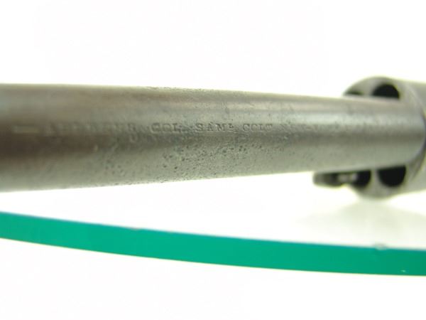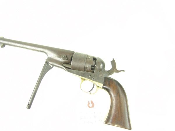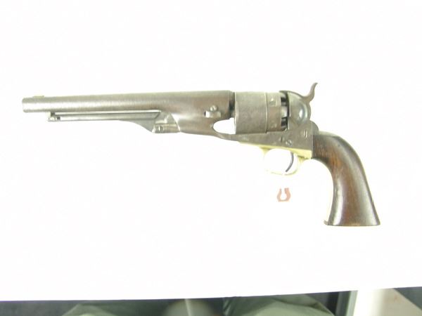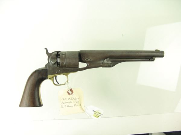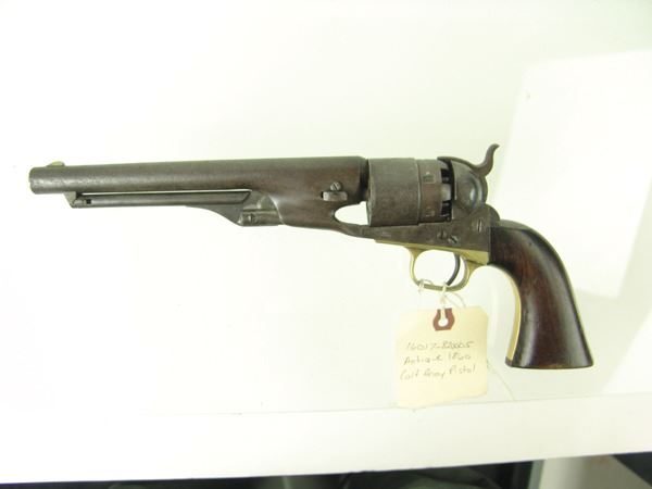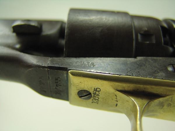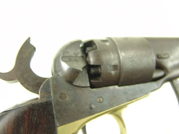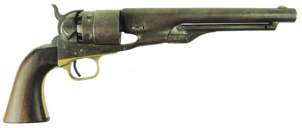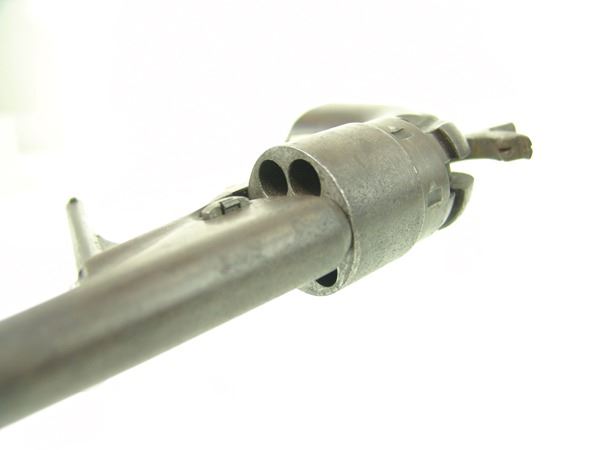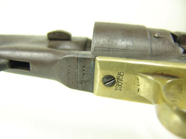 Early, .44 cal. 6-shot revolver with rebated, nautically engraved cylinder, 8" round barrel, creeping style loading lever, and brass trigger guard. Good, well used condition. S/N 136755
