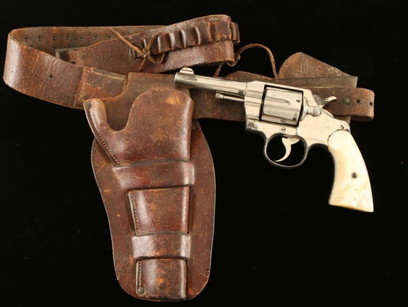 D,A. revolver with a 4" barrel, nickel finish, pearl grips. In Heiser Denver Western Pre-War double loop holster. 75-85% nickel starting to drift and some erosion and pitting where finish has lifted. Pearls of Pre-War era. Holster Fair to Good and well marked. Good action, bore shows much firing and wear-Fair to Good and well marked. Good action, bore shows much firing and wear. Fair only. *C&R Fiream*