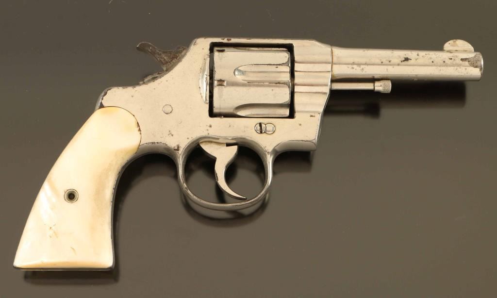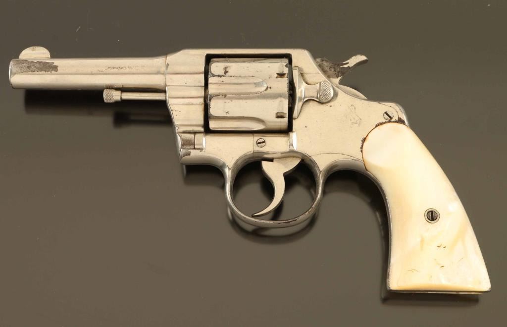 Revolver, Six-Shot. Double-Action. Manufactured 1908-27. This revolver was made in 1913. Nickel-plated, (Old refinish)with Mother-of-Pearl grips (Good Fit). Grips are pre-war. 4" tapered barrel, with open sights. Exposed cylinder rod. Bore is fair, with some slight pitting. Colt 2-line address on top of barrel. Proper Colt markings on left side of barrel. Rampant Colt of left side of frame, feint, but there. Nickel finish is about 80%, with loss around the muzzle, hammer, frame, front of cylinder, and backstrap. Action is tight. NRA condition-Good C&R Eligible.