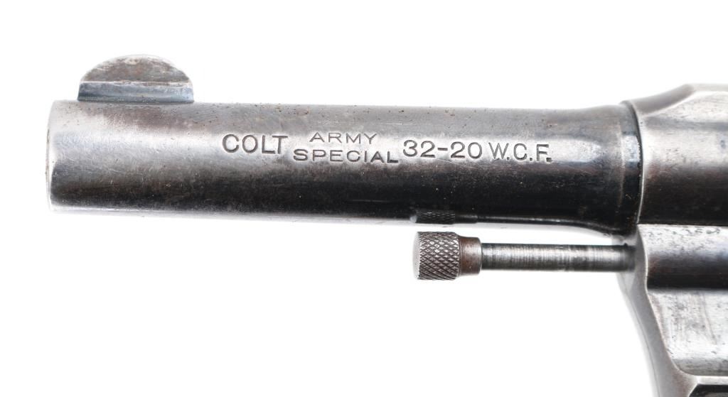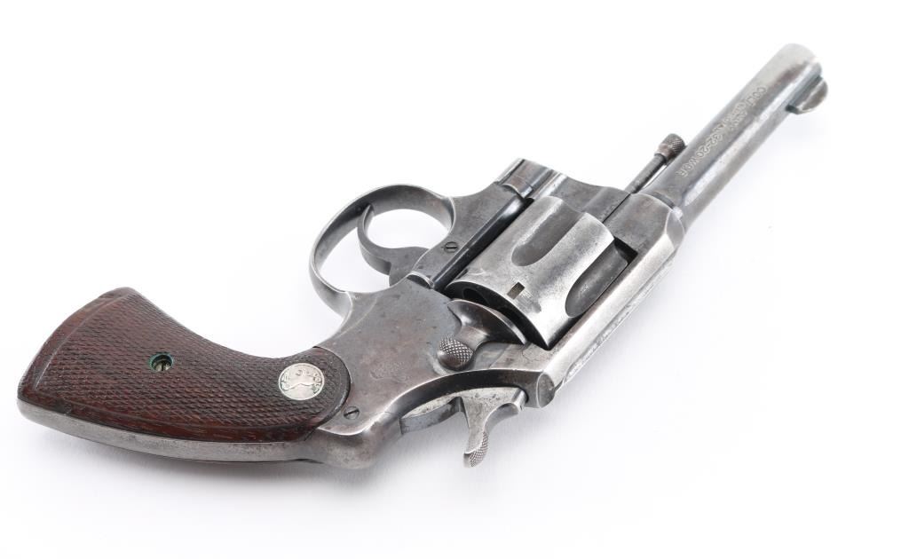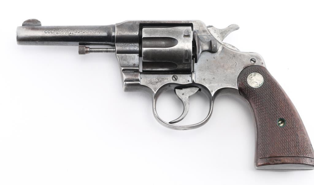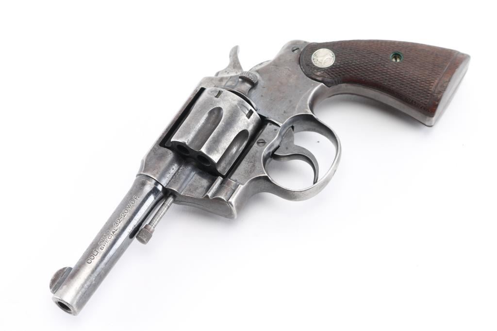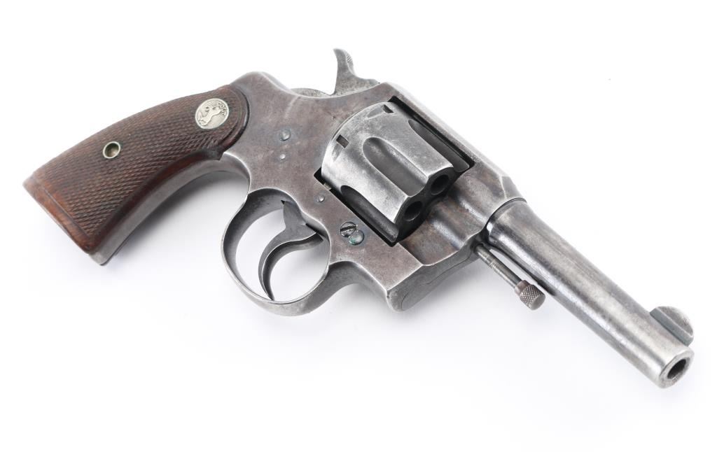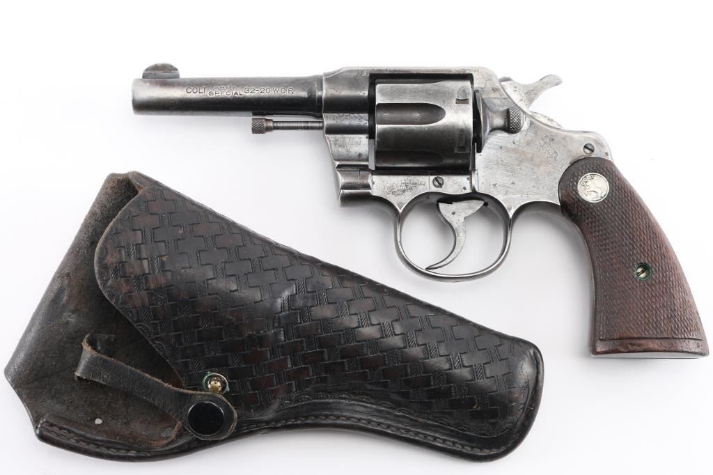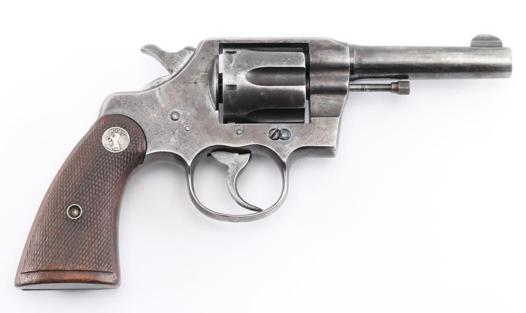 Vintage Colt manufactured 1916.Medium frame double/single action revolver features blued finish, checkered wood grips with Colt medallions, 4" barrel, fixed sights. Bore is fair condition with light pitting throughout. Retains 25% blue with much bare metal on sharp edges, sides of barrel, high spots. Grips are good condition with wear to checkered points. Action is stiff with a sticky hesitation in the middle of the trigger pull or when cocking the hammer. Includes vintage basket weave black leather snap holster. Condition is NRA Fair. C&R Firearm.
