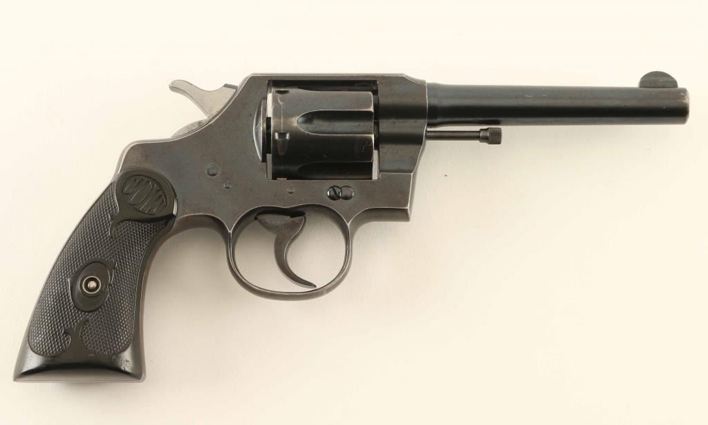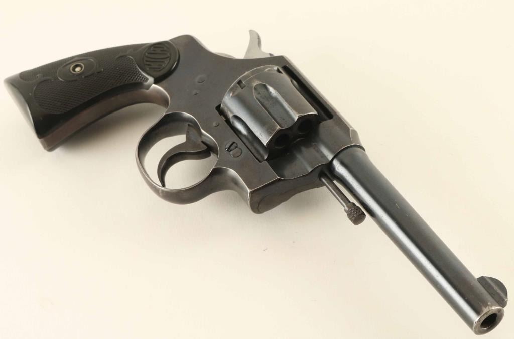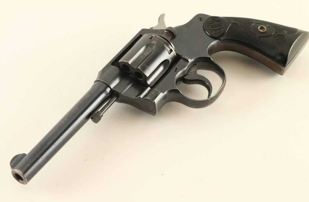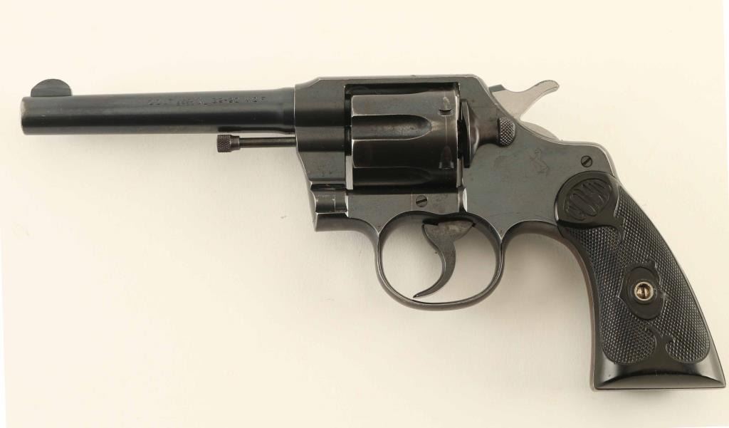 Double action revolver chambered in 32-20, manufactured circa 1922. Features blued finish, black checkered 'gutta percha' grips marked 'COLT', fixed sights, 5" barrel, 6 shot swing-out cylinder, fires in double or single action mode. Bore is in very good condition, bright with strong rifling and light pitting visible throughout. Charge holes are bright and appear smooth. Retains 85% coverage of original blue turning a bit gray on frame, with dark plum color at grip straps. Patina forming on cylinder, with a visible line of patina forming all around high parts of cylinder about 1/4" back from front edge. Thin lines of bare metal at most sharp edges. Barrel appears noticeably darker blue than remainder of gun, has bare metal at muzzle in holster wear pattern. Several dents the size of punch marks on top strap and some denting to sides of front sight. Sides of hammer polished bright. "Rampant Colt" emblem on left side plate and barrel address/patent markings are crisp. Grips are in very good condition, complete, with slight shrinkage that is barely noticeable. Action is smooth and lock-up is tight. Condition is NRA Fine ***C&R Firearm***