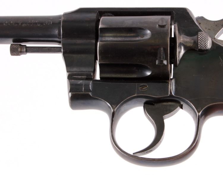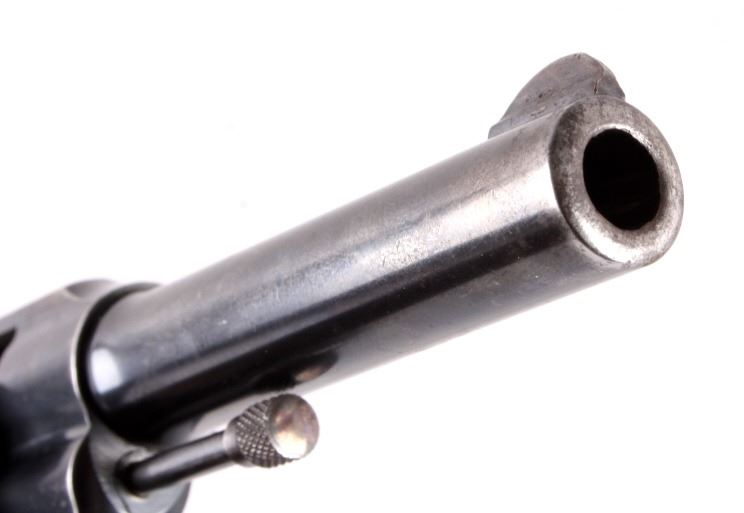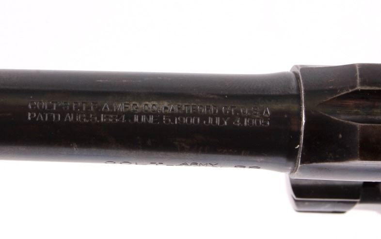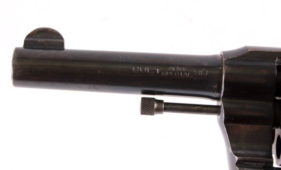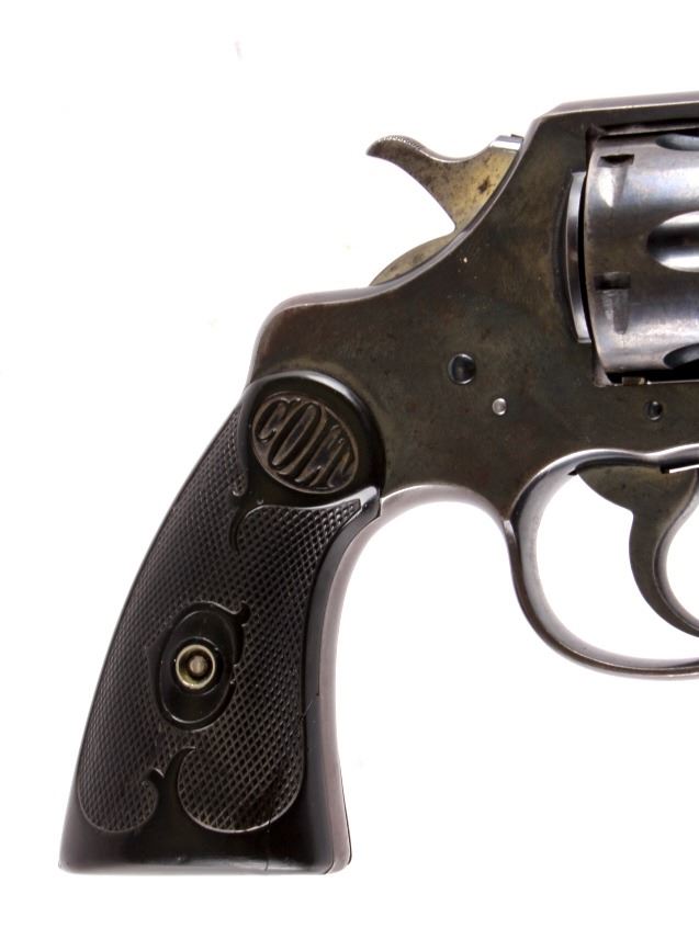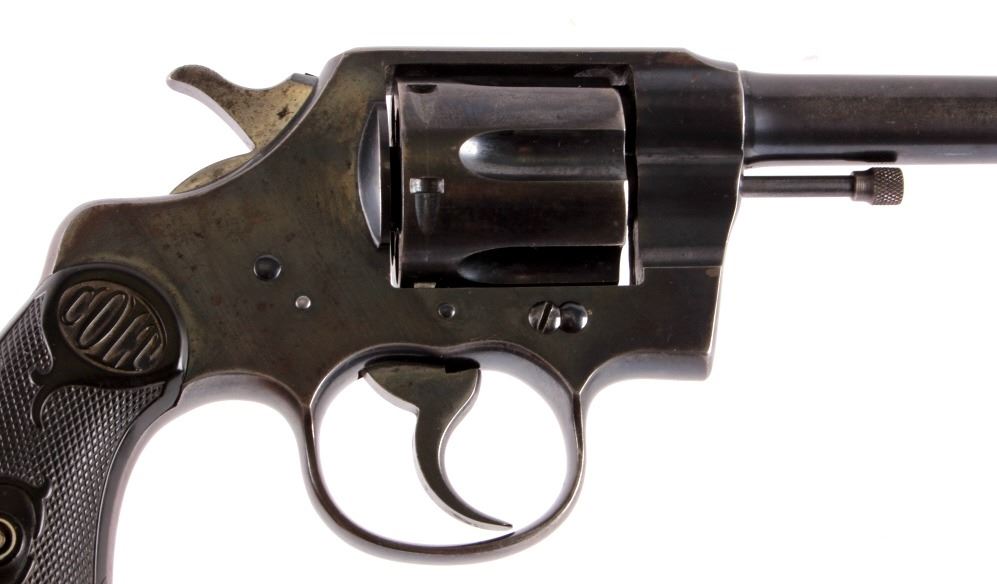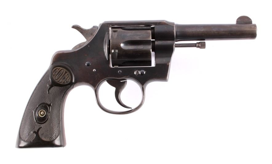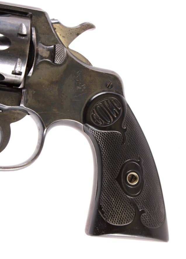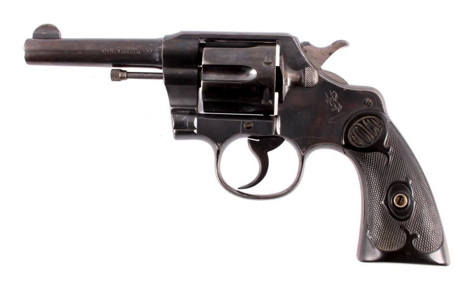 This is a Colt Army Special revolver chambered in the .38 special caliber and was manufactured in 1919. The revolver features a blued finish with a six shot cylinder and 4" barrel. The C/3 grips are marked "Colt" near the top with a "C" in the center. The barrel is marked "Colt's Pt. F.A. Mfg. Co. Hartford Ct. U.S.A." and "Colt Army Special 38". The Colt revolver is in good condition. It measures 4.75" x 9.25". Serial number 443069 P