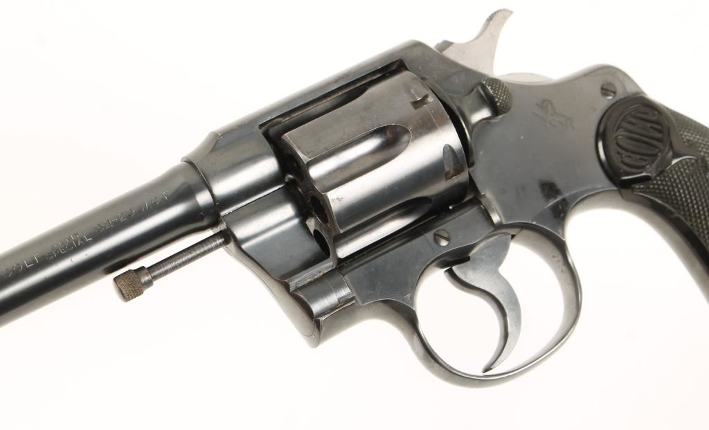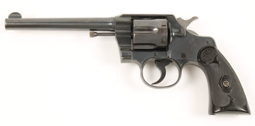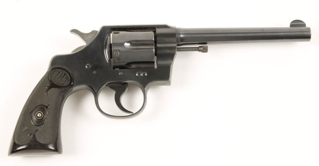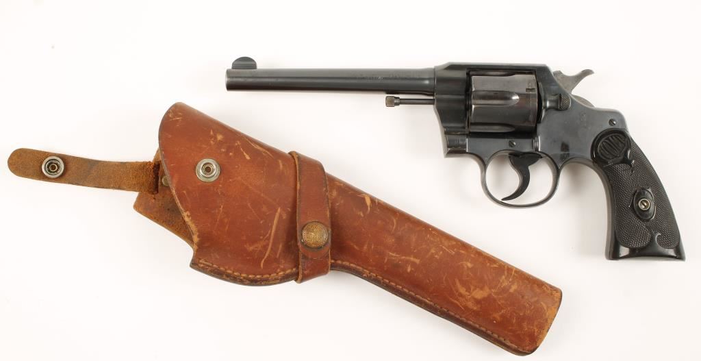 Blued double-action 6-shot revolver with a 6" barrel. Finish is very good showing only the slightest of edge wear and speckling on the butt. The bore is bright and shiny with sharp rifling. The chambers are also shiny. The grips are checkered hard rubber with a few dings and a few small chips missing. Includes a Brauer Bros. open top holster. Condition is very good. *Modern Firearm*