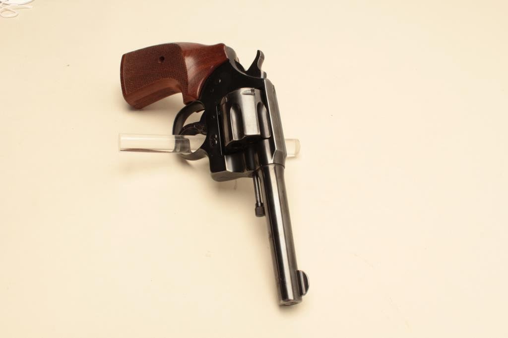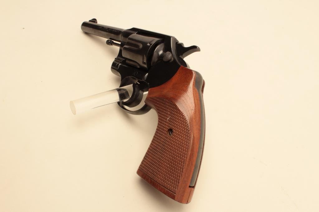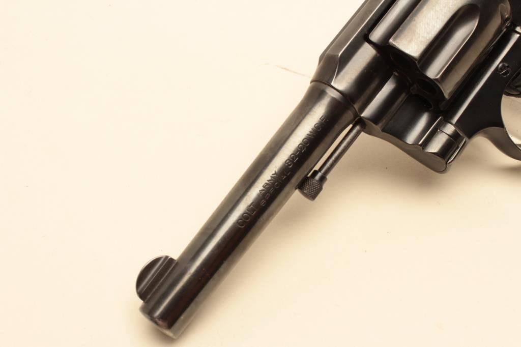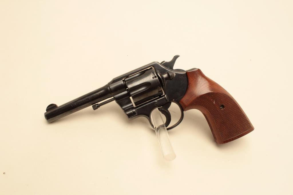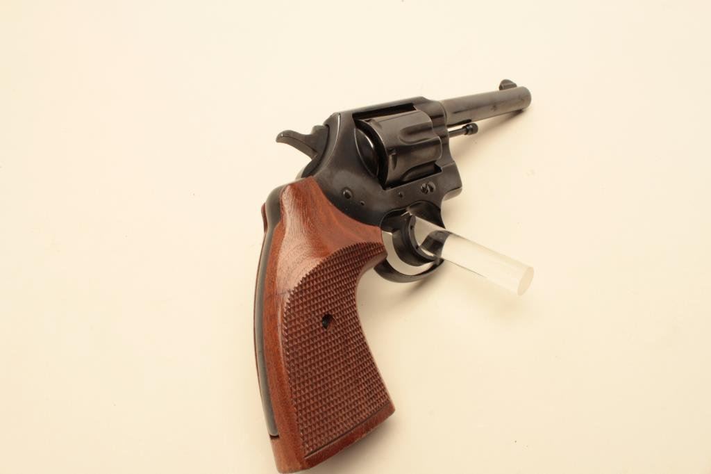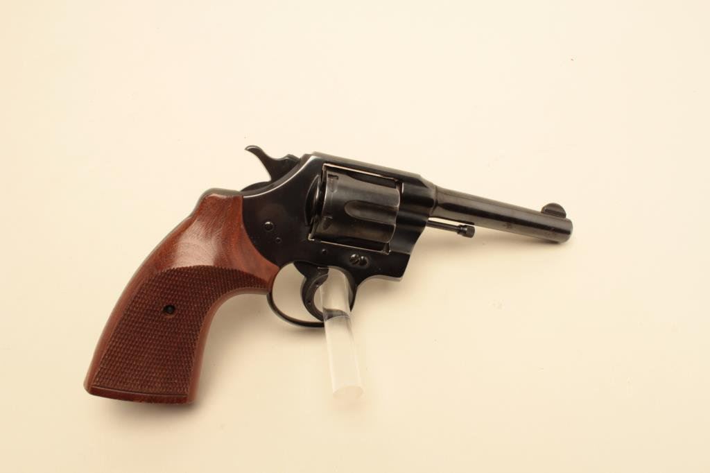re-blued finish, checkered wood replacement grips, S/N 320060, good bore, crisp action, very good grips; trigger shoe added. (C&R/PPT). Est.: $200-$400.