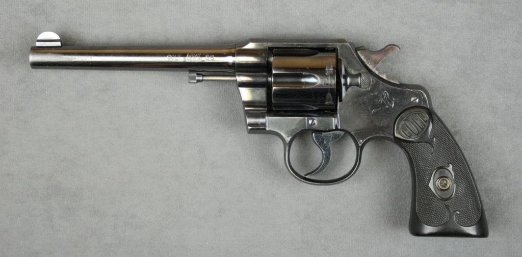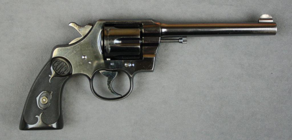 Colt Army Special DA revolver, .38 cal., 6”  barrel, blue finish, checkered hard rubber  grips, #343782. This gun is in overall fine  to excellent condition showing approx. 85%  original bright blue finish with lossprimarily at the muzzle, fine bore, action,  markings and grips.  Est.:  $350-$550.
