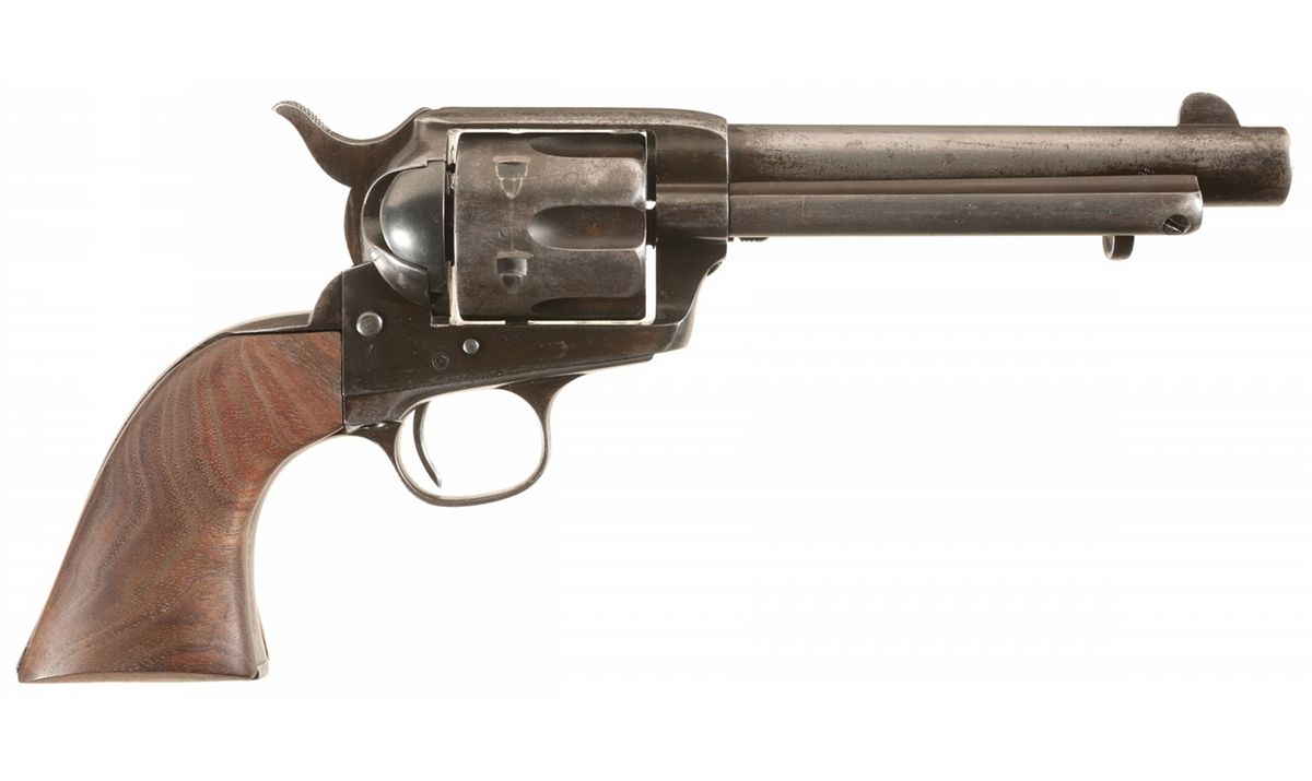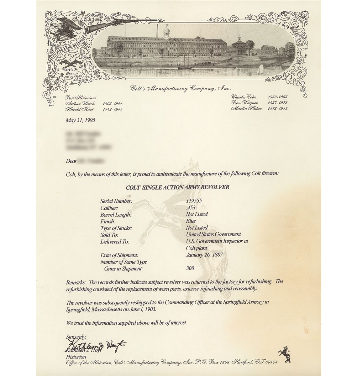 Manufactured in 1887. Factory letter verifies the caliber and blue finish, barrel length and grips as "Not Listed", and that it was shipped as 1 of 300 to the U.S. Government Inspector at the Colt Plant on January 26, 1887. The letter further states that the revolver was returned to the factory to be refurbished and reshipped to the Commanding Officer at the Springfield Armory on June 1, 1903.