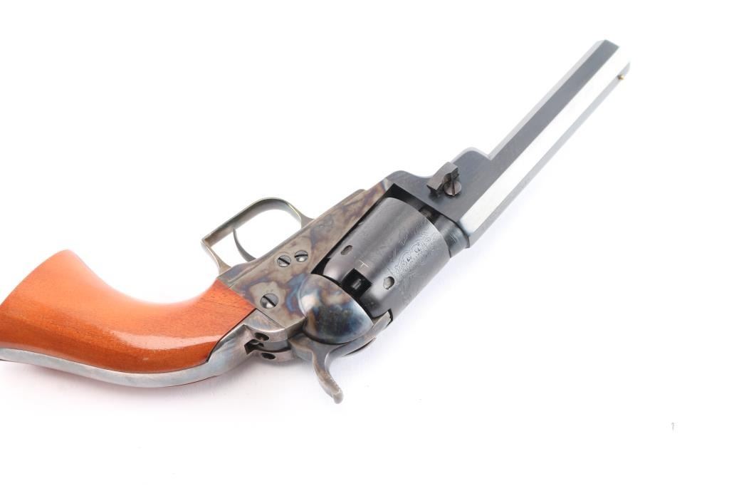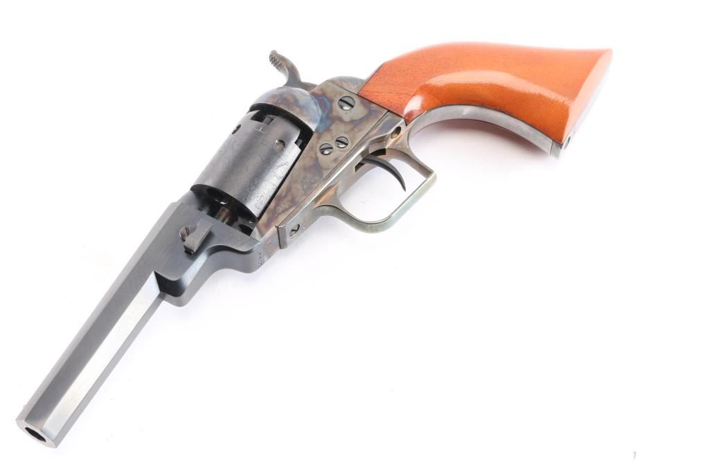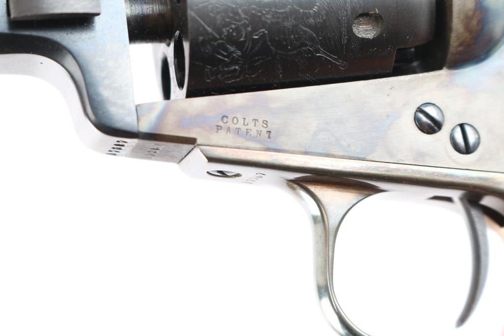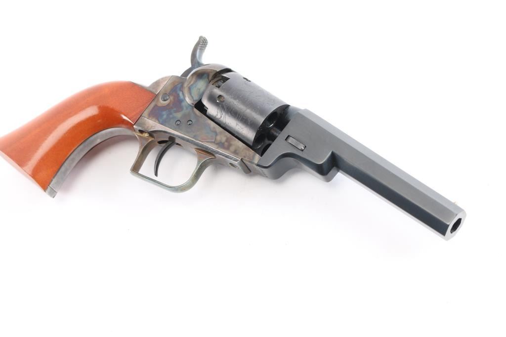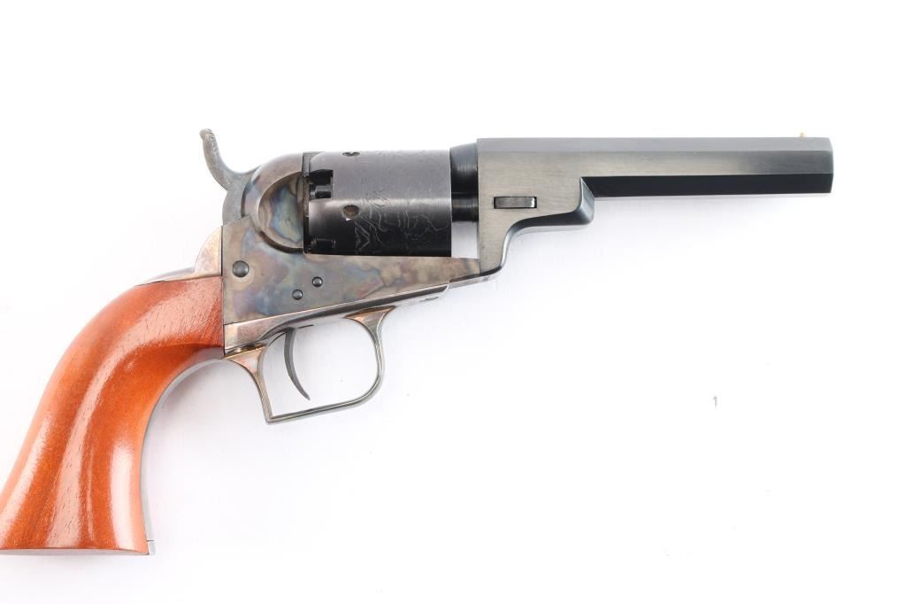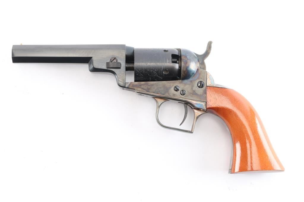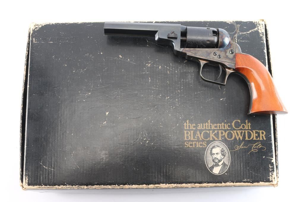 'The Authentic Colt Blackpowder Series' 2nd generation reproduction of the Baby Dragoon. A single action percussion revolver chambered for .31 caliber ammunition, and manufactured circa 1979-1984. It features a 4" octagon barrel, brass cone front sight, 'V' notched rear sight cut in the hammer nose, checkered hammer spur, unfluted five-shot cylinder with roll-engraved battle scene, no loading lever, silver plated square-back triggerguard, smooth silver plated backstrap, and one-piece smooth walnut grip. The silver plating on the trigger guard and backstrap are in very good condition with a blemish on the front strap, and the finish is turning dark. The color-case hardened finish on the frame and hammer is in excellent condition. The bluing on the barrel and cylinder has approximately 99% of the finish remaining with no observed blemishes.The action is smooth and crisp. The bore, rifling, and cylinder are in excellent condition. This firearm includes a factory cardboard box with fitted insert, and paperwork. The overall condition is excellent with few signs of handling.