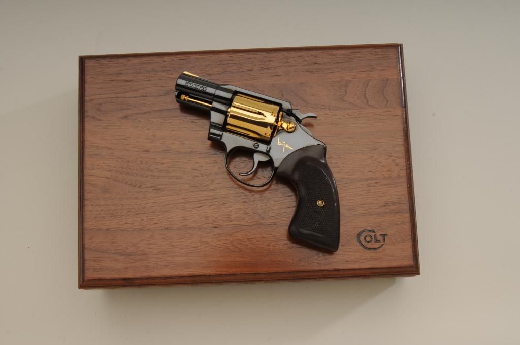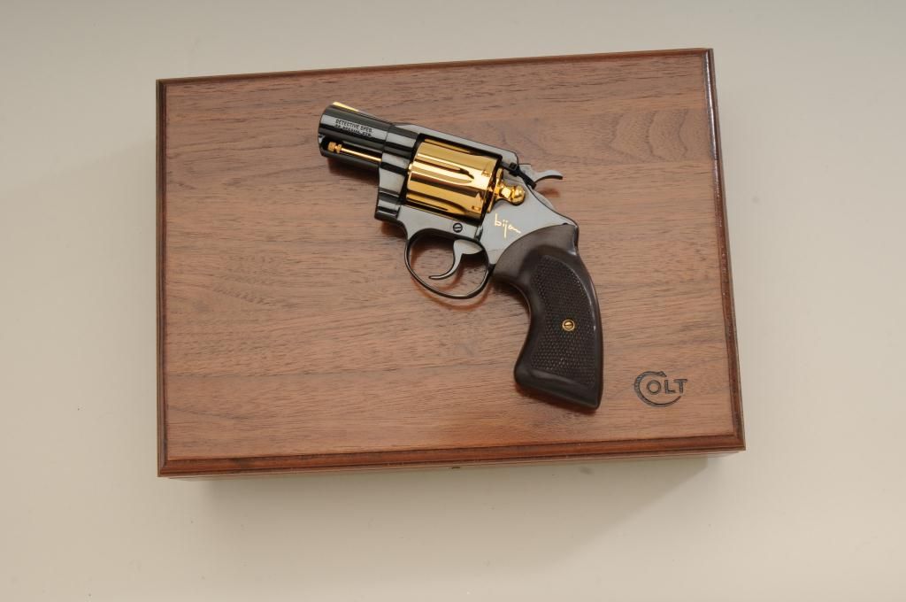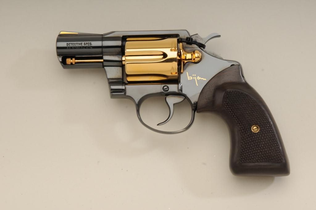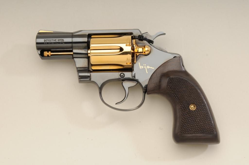 Colt Bijan designer revolver, Detective special model, serial number Bijan 83, in .38 special caliber, 2” barrel, royal blue finish with gold plated cylinder, ejector rod and small parts with wraparound walnutstocks shipped to Wendy Burr at Colt Firearms Hartford, Conn. On June 2, 1993. Under remarks, the factory letter states, “The special edition offering above-described revolver incorporates the Bijan logo in 24karat gold and also number 83 on right side. The front sight and frame is gold inlaid with gold plated small parts”. Also the letter states that originally 100 were ordered by Bijan but only 30 were delivered. Theremaining 70 lots that were not delivered were sold to Colt employees of which Wendy Burr was so employed. The revolver is contained within a factory presentation display case which is in excellent condition. The revolver shows no evidence of firing or use and is near mint at least 99% plus original finish. Also includes cardboard box end label Est.: $1,500-$3,000.
