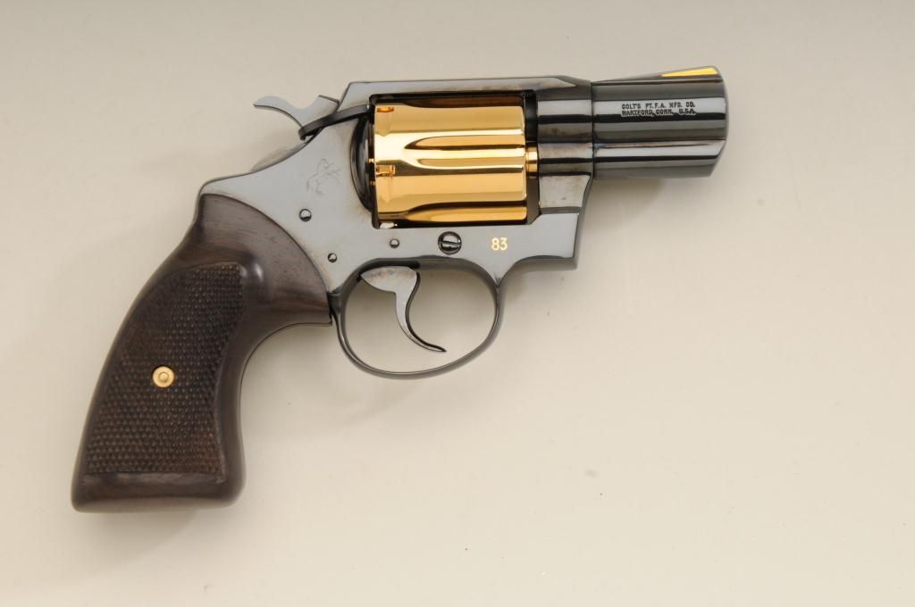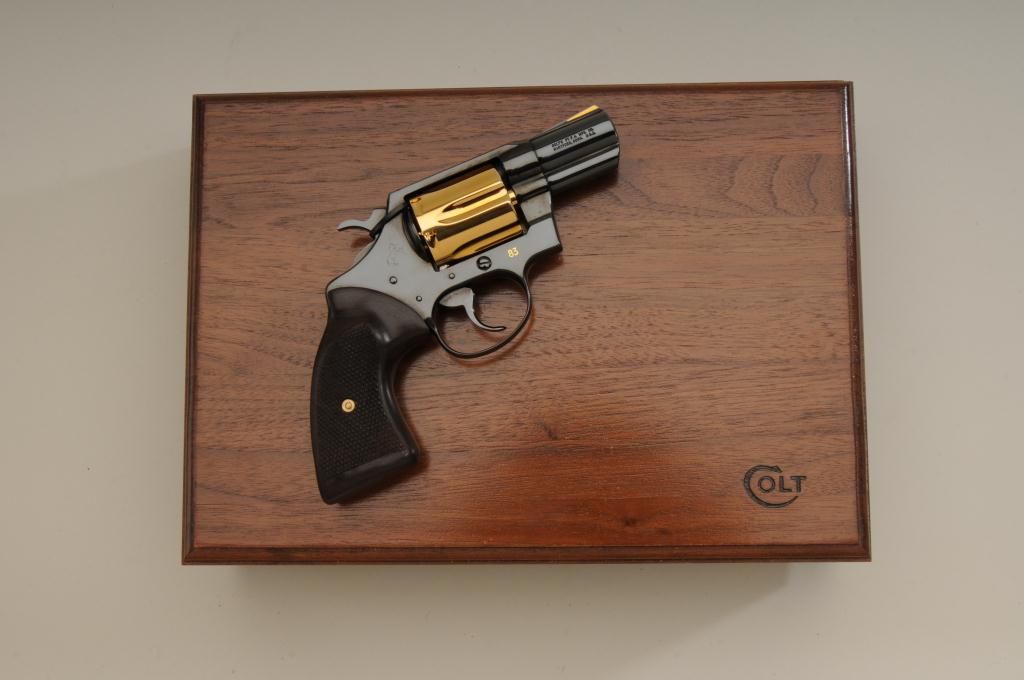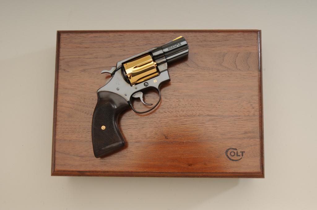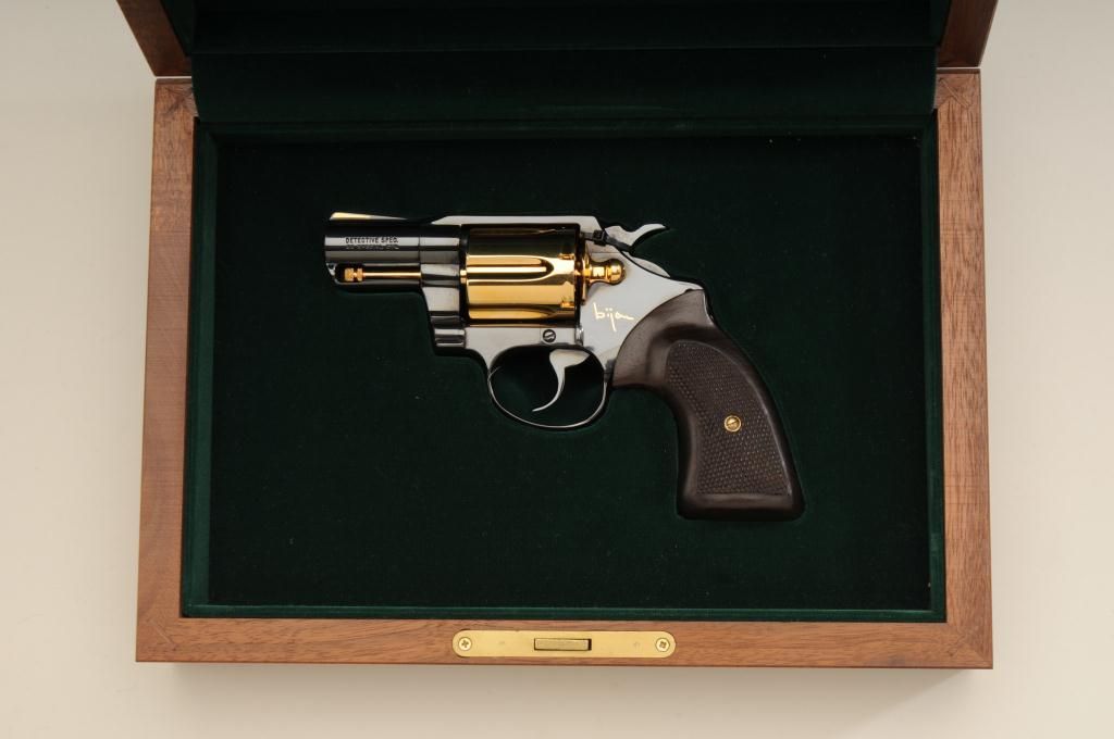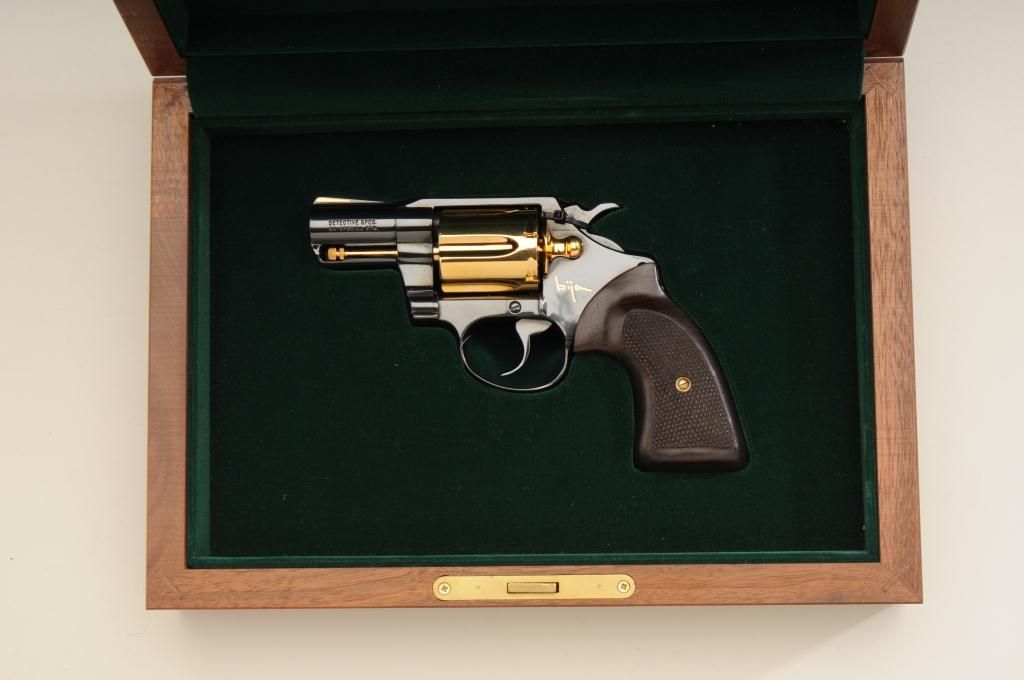Colt Bijan designer revolver, Detective special model, serial number Bijan 83, in .38 special caliber, 2” barrel, royal blue finish with gold plated cylinder, ejector rod and small parts with wraparound walnutstocks shipped to Wendy Burr at Colt Firearms Hartford, Conn. On June 2, 1993. Under remarks, the factory letter states, “The special edition offering above-described revolver incorporates the Bijan logo in 24karat gold and also number 83 on right side. The front sight and frame is gold inlaid with gold plated small parts”. Also the letter states that originally 100 were ordered by Bijan but only 30 were delivered. Theremaining 70 lots that were not delivered were sold to Colt employees of which Wendy Burr was so employed. The revolver is contained within a factory presentation display case which is in excellent condition. The revolver shows no evidence of firing or use and is near mint at least 99% plus original finish. Also includes cardboard box end label Est.: $1,500-$3,000.