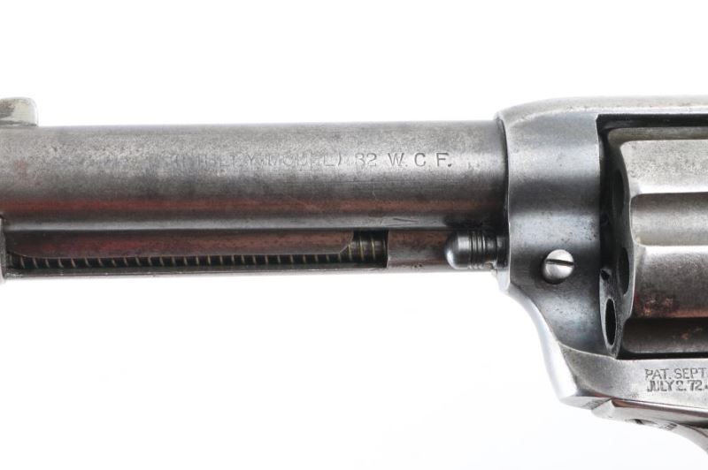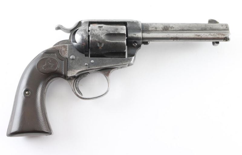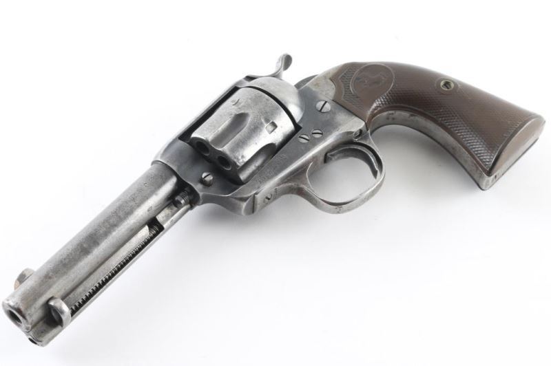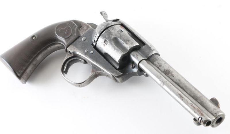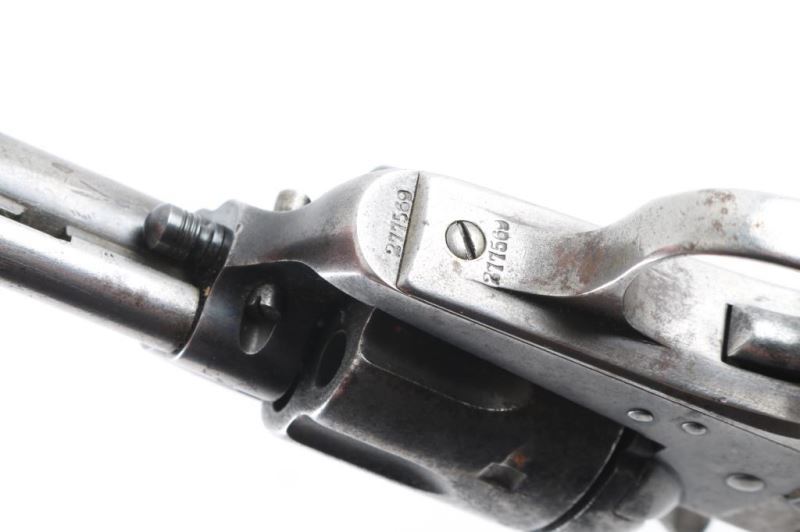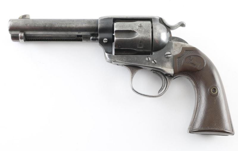 Single action revolver manufactured circa 1906. Features 4.75" barrel, fixed sights, checkered composition grips with rampant colt logo, Bisley shaped grip. Bore is fair condition, dark & lightly pitted throughout with visible shallow rifling. Charge holes are fair to good condition, showing patina. Metal surfaces show gray color, thinning to silver in raised areas, darker gray in recesses, spots of brown patina color, patches of thicker patina scattered throughout. Small rust patch on cylinder. Numbers match on frame & grip straps. Grips are good condition, chocolate brown color, show smoothing from use, no visible cracks or chips missing. Action is smooth with good lock-up. Condition is NRA Good *** C&R Firearm ***