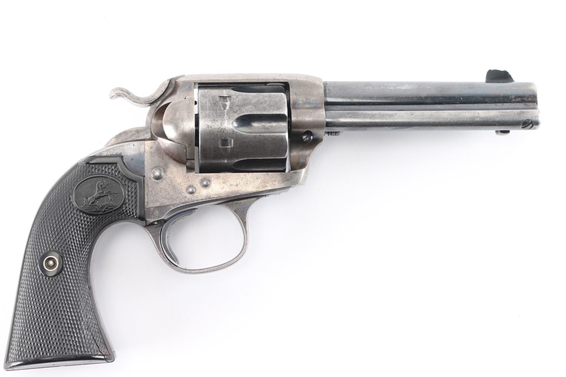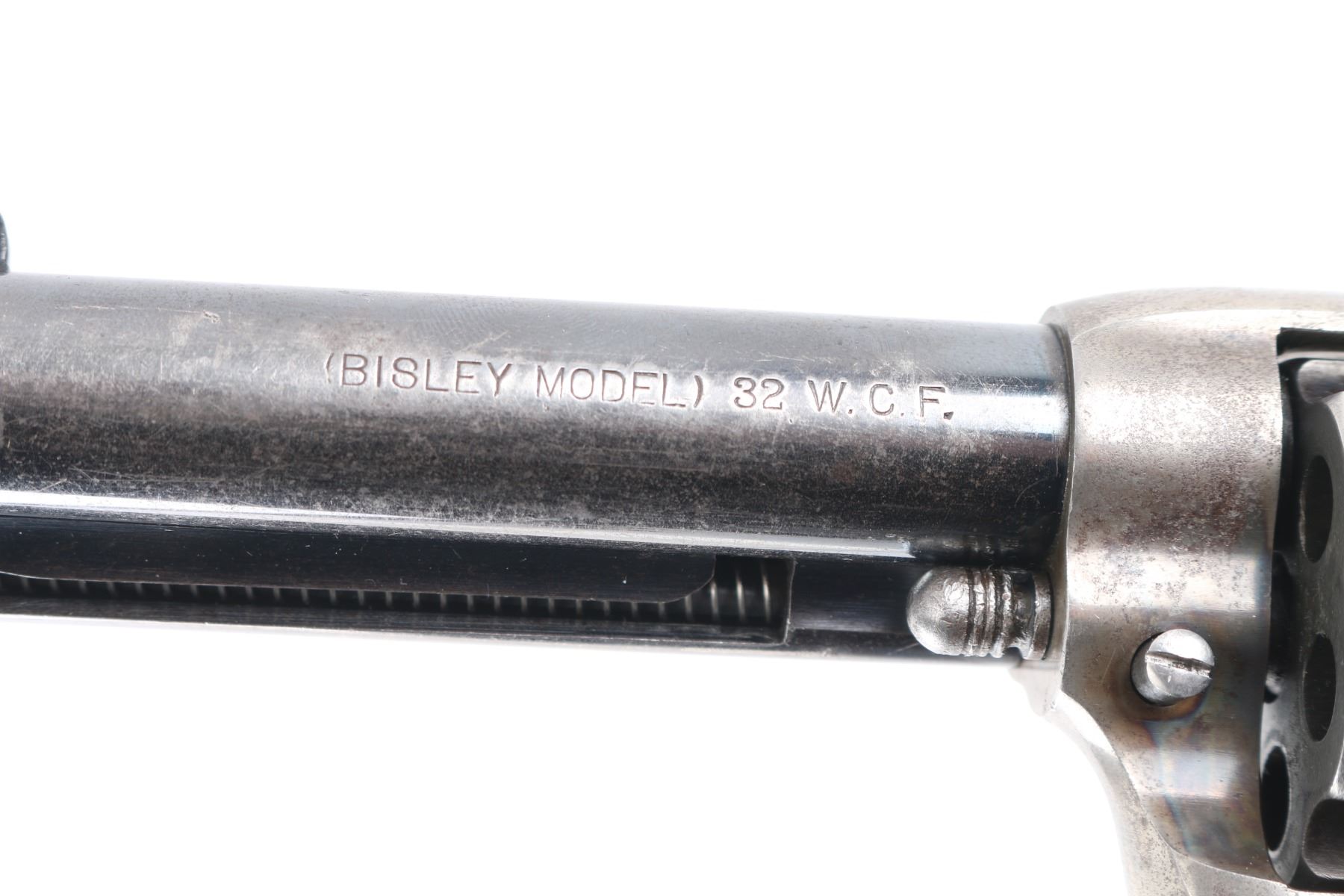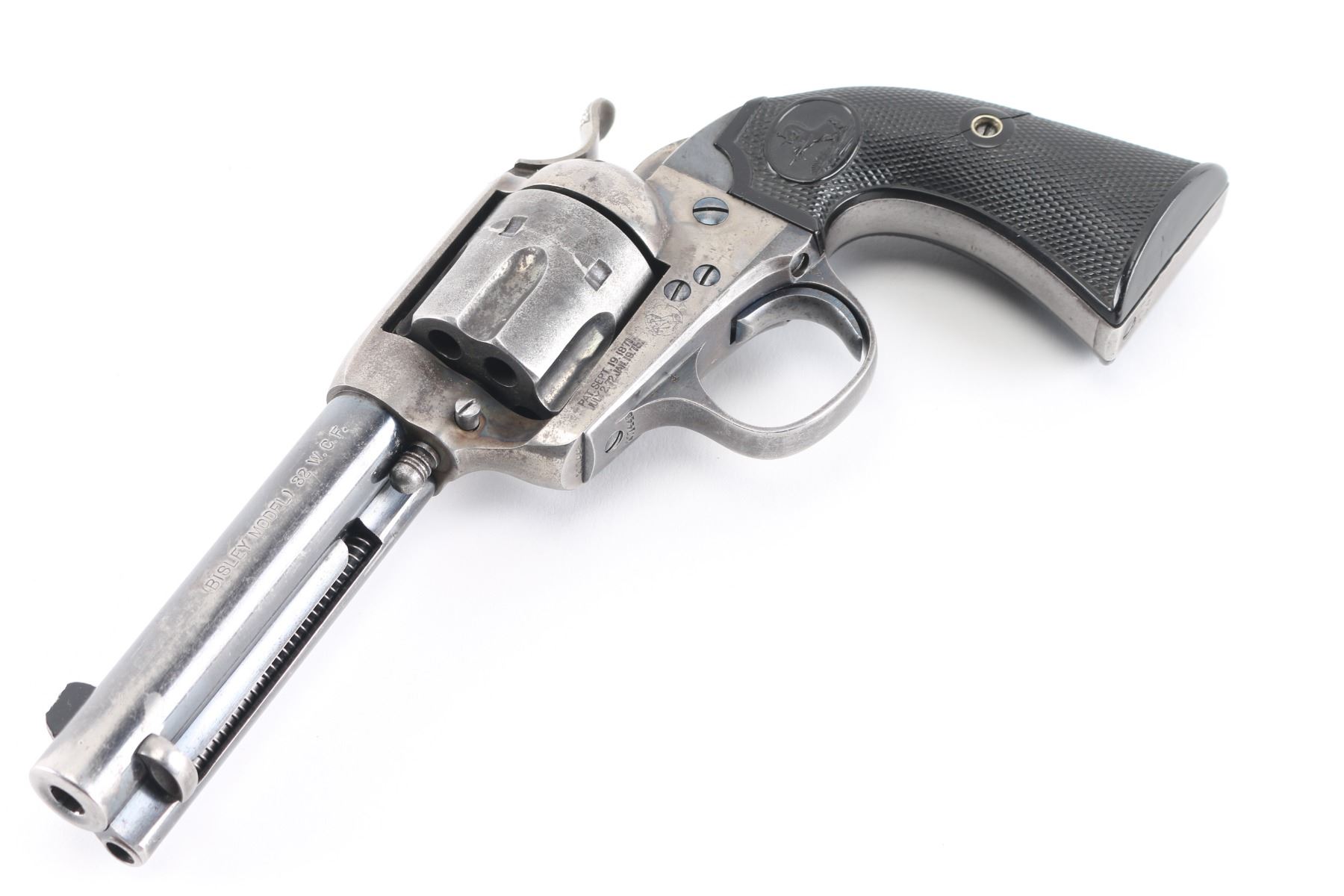 SN: 277446, Caliber 32-20. The accompanying Colt factory letter dated August 28, 2007, confirms configuration and shipment to Pacific Hardware and Steel Company, San Francisco, California, on May 1, 1906, just 12 days after the San Francisco earthquake tragedy! One of a five gun shipment. Pacific Hardware had been constructed just one year prior and was one of the few buildings to survive in the district. (It is a National landmark today) It was miraculous it was delivered at all as the earthquake and ensuing fires destroyed over 80% of the buildings with 3000 killed. In the ensuing chaos, the mayor ordered looters to be "Shot on sight". "Hardware dealers sold an estimated 200,000 pistols in one month". (Writer Lately Thomas) The Army was called in, and groups of armed citizens roamed the streets. The official count is nine looters shot dead, but some estimate up to 300. The features of this Colt are as follows: Blade front sight (damaged) and frame notch rear sight. Two line block letter address on top of the barrel, "(BISLEY MODEL) 32 W.C.F." on the left side of the barrel and the left side of the frame is marked with the two-line, three patent dates followed by the circled Rampant Colt. The frame and hammer were casehardened, and the remaining metal surfaces were blue. Wide low hammer spur and wide trigger with characteristic "humpback" grip. Matching serial number on frame, trigger guard and backstrap, and the loading gate is unmarked. The left rear of the trigger guard is marked with the Colt triangle "VP" proof, and the left front is marked with the number "3". Fitted with two piece checkered hard rubber grips with the Rampant Colt in an oval at the tops, right grip shows an old repair, and the left panel is broken in half but is retained on the gun without assistance. The bore is very good, strong rifling, action is crisp/smooth, blue is about 60%, with traces of the case colors remaining on the frame. All marking are excellent, clear. A nice conditioned Bisley with a fantastic history.