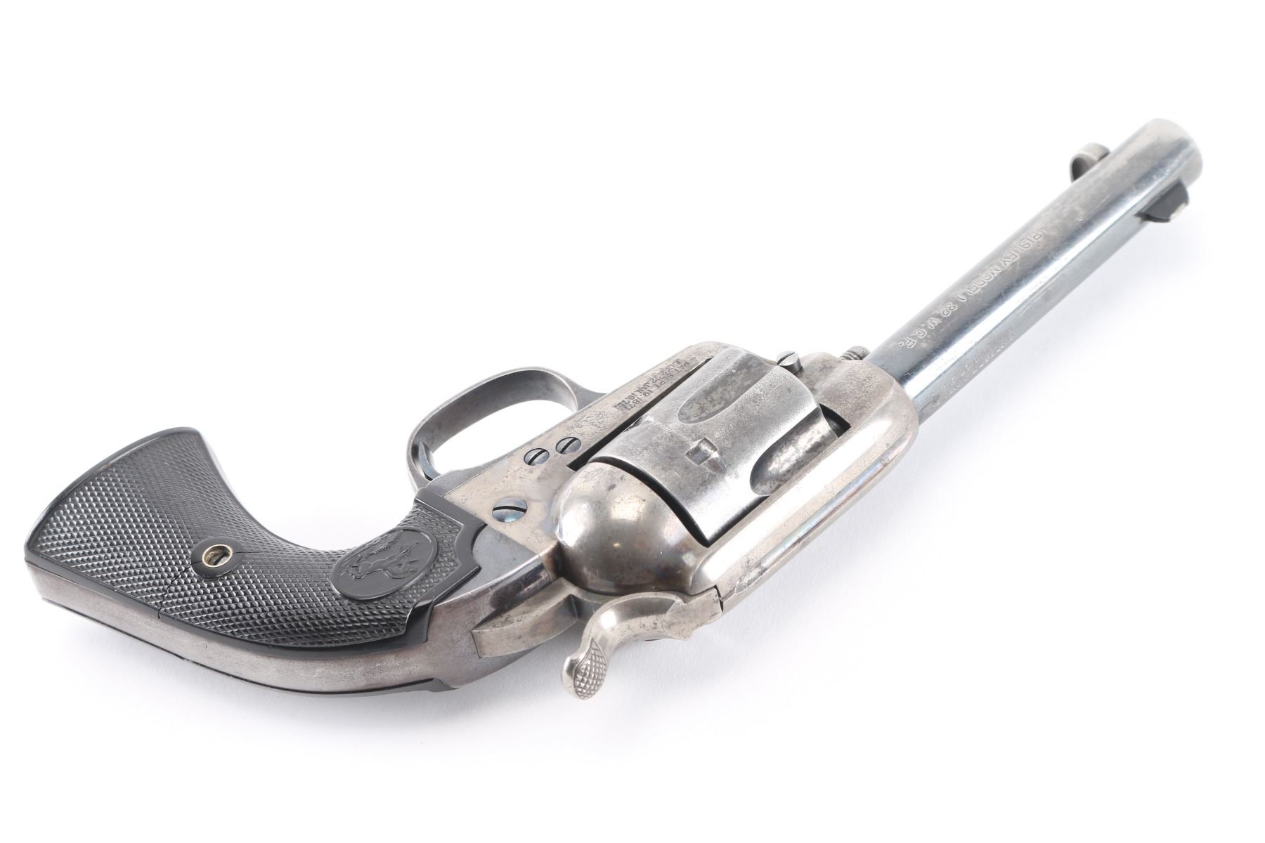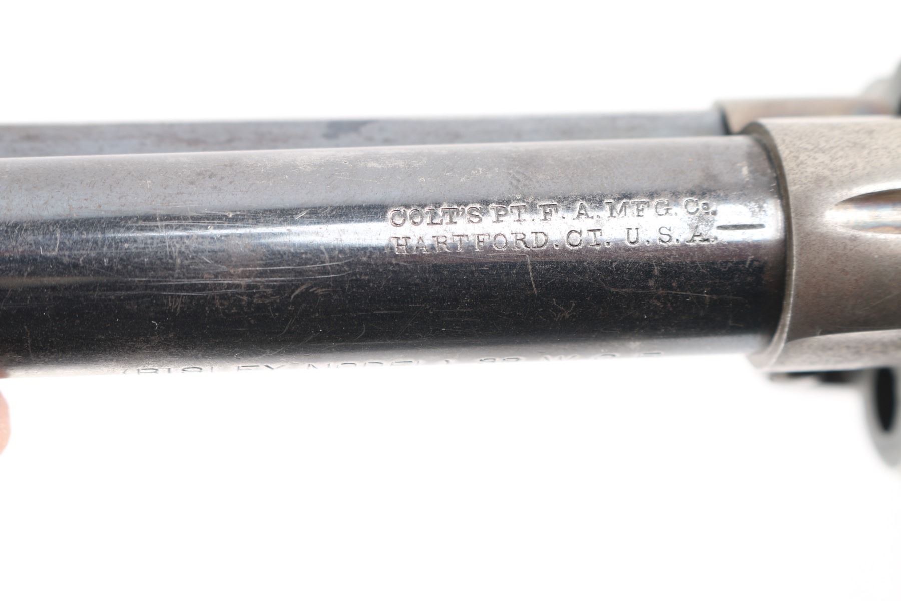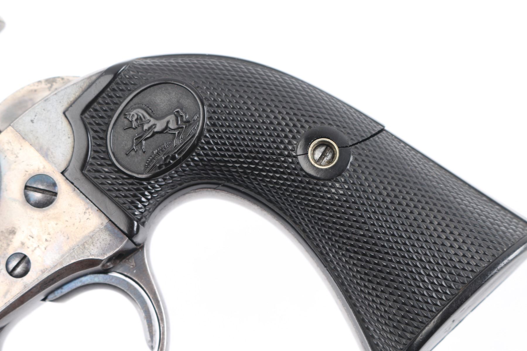 SN: 277446, Caliber 32-20. The accompanying Colt factory letter dated August 28, 2007, confirms configuration and shipment to Pacific Hardware and Steel Company, San Francisco, California, on May 1, 1906, just 12 days after the San Francisco earthquake tragedy! One of a five gun shipment. Pacific Hardware had been constructed just one year prior and was one of the few buildings to survive in the district. (It is a National landmark today) It was miraculous it was delivered at all as the earthquake and ensuing fires destroyed over 80% of the buildings with 3000 killed. In the ensuing chaos, the mayor ordered looters to be "Shot on sight". "Hardware dealers sold an estimated 200,000 pistols in one month". (Writer Lately Thomas) The Army was called in, and groups of armed citizens roamed the streets. The official count is nine looters shot dead, but some estimate up to 300. The features of this Colt are as follows: Blade front sight (damaged) and frame notch rear sight. Two line block letter address on top of the barrel, "(BISLEY MODEL) 32 W.C.F." on the left side of the barrel and the left side of the frame is marked with the two-line, three patent dates followed by the circled Rampant Colt. The frame and hammer were casehardened, and the remaining metal surfaces were blue. Wide low hammer spur and wide trigger with characteristic "humpback" grip. Matching serial number on frame, trigger guard and backstrap, and the loading gate is unmarked. The left rear of the trigger guard is marked with the Colt triangle "VP" proof, and the left front is marked with the number "3". Fitted with two piece checkered hard rubber grips with the Rampant Colt in an oval at the tops, right grip shows an old repair, and the left panel is broken in half but is retained on the gun without assistance. The bore is very good, strong rifling, action is crisp/smooth, blue is about 60%, with traces of the case colors remaining on the frame. All marking are excellent, clear. A nice conditioned Bisley with a fantastic history.