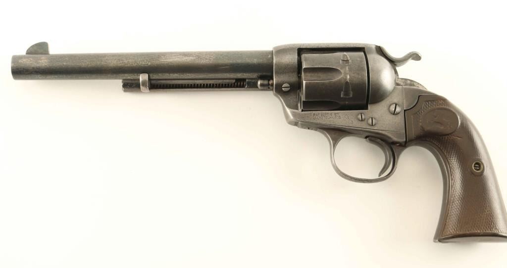 'First Generation' Vintage single action six-shot revolver chambered in .38 Long Colt(one of only 412 Bisley revolvers chambered for this caliber), manufactured circa 1907. Introduced in 1894, the Colt Bisley was marketed as a target revolver and was named after the Bisley shooting range in England. Features a blued finish, 7 1/2" barrel with single line address, unaltered blade front sight, 'v' notched rear sight, ejector rod, smooth wide trigger, knurled wide low-profile hammer spur, fluted cylinder, and two-piece checkered hard rubber grips with Rampant Colt decor. Serial numbers match on the frame, triggerguard and backstrap. Revolver exhibits approximately 10% of it's old blued refinish with scattered pitting and the majority of the metal surfaces in-the-white. Action is strong with four clicks & very good lock-up, the bore is bright with some minor pitting, markings are mostly visible and the hard rubber grips are fair to good as worn semi-smooth. Condition is NRA Good as refinished. ***C&R Firearm***