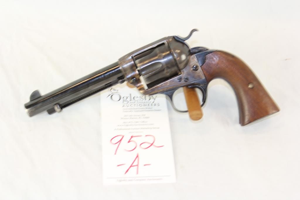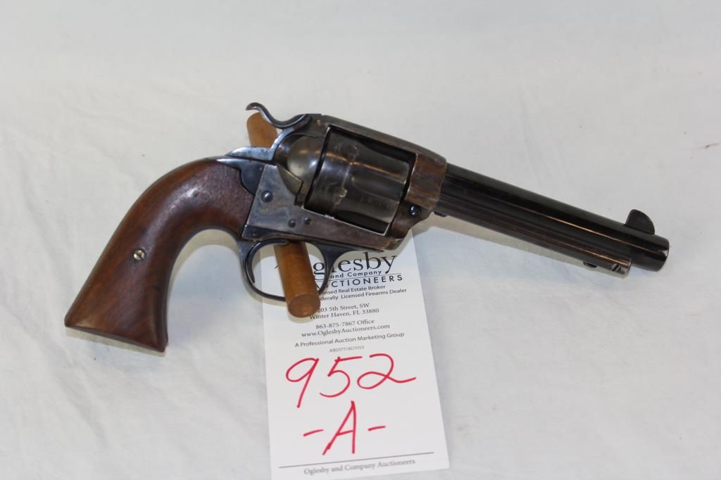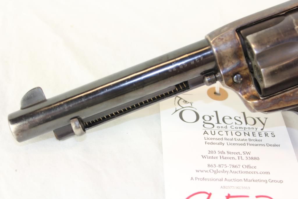 4-3/4" Barrel, Some Case Coloring remains on frame. Bluing shows signs of normal wear and is consistent with grip wear. Barrel is marked "COLT'S PT. F.A. MFG. Co. HARTFORD, CT. U.S.A." and "44 40 WCF". Serial number on trigger guard does not match and screw just forward of trigger guard is missing. Does not appear to be a complete, original Bisley, but would be a good shooter.