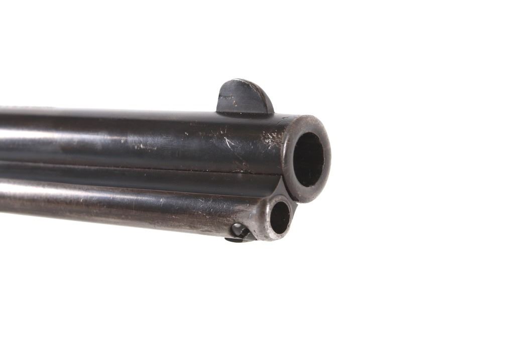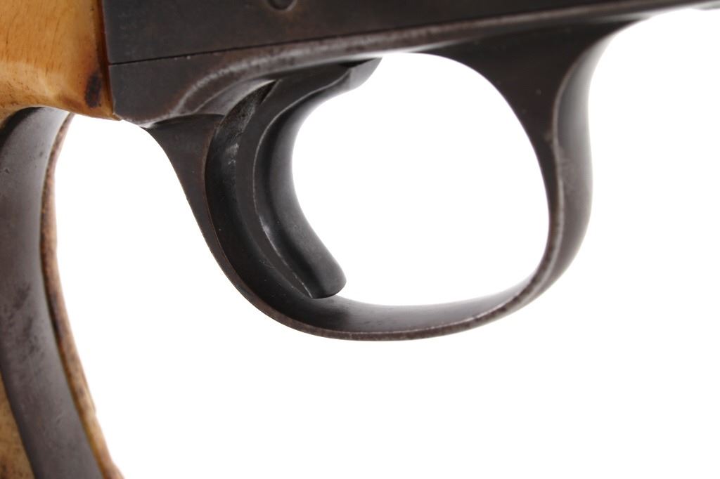 In this lot is a Colt Bisley .44-40 Frontier Six Shooter with desirable 4 ¾” barrel made1904. This is a lovely untouched example that was period fitted with now mellow and aged stag grips. During this time of production the most common caliber for this iconic handgun was .32-20 with the .38-40 close behind in sales. The big .44-40 and .45 Colt Bisleys were made in fewer numbers and are now difficult to find. The .44-40 or .44 W.C.F. (Winchester Center Fire) chambered Colts were typically paired with a rifle or carbine of the same caliber and are almost always associated with frontier use. In fact, only this chambering has the “COLT FRONTIER SIX SHOOTER” stamping below “(BISLEY MODEL)” on the left side of the barrel. This is a truly fine example showing good lightly aged blue on the cylinder, fine blue on the barrel with only some wear and browning on the left side from holster carry. The ejector housing retains excellent blue on the top and bottom portions with some of the outside showing wear again from holster carry. The barrel top retains the sharp two line Colt address marking that was only used on 4 ¾” revolvers with the more common 5 ½” and 7 ½” versions having a one line marking. This revolver with serial number 254846 also retains screws with excellent screw heads and an unmarred cylinder pin. The action is fine and the bore is surprisingly excellent with sharp rifling all the way through. The case colored frame and blued grip straps have aged to a soft and uncleaned plum-brown patina with fine blue on the trigger guard sides and protected areas. This Colt also has matching serial numbers on the frame, trigger guard and grip strap along with sharp patent markings on the left side of the frame. The Bisley variation of the famed Single Action Army was a popular arm on the