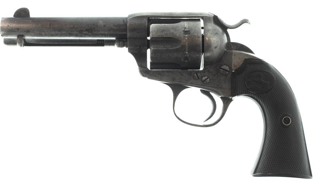 single action revolver 4 3/4" barrel, blue finish and hard rubber checkered Colt grips. Remain good condition, visible bright blue approx. 30% to barrel and ejector rod housing, remainder shows silver gray patina, light areas of surface erosion, original grips at least good with light flattening in small areas to left side. All matching visible serial numbers. Nice tight action, shiny bore. Mfg'd 1905, FFL required.
