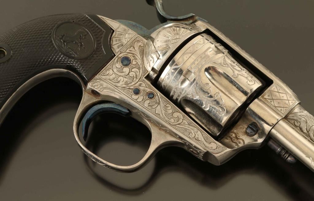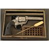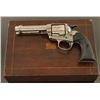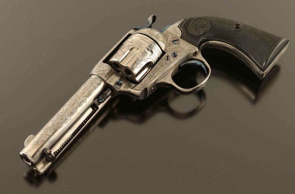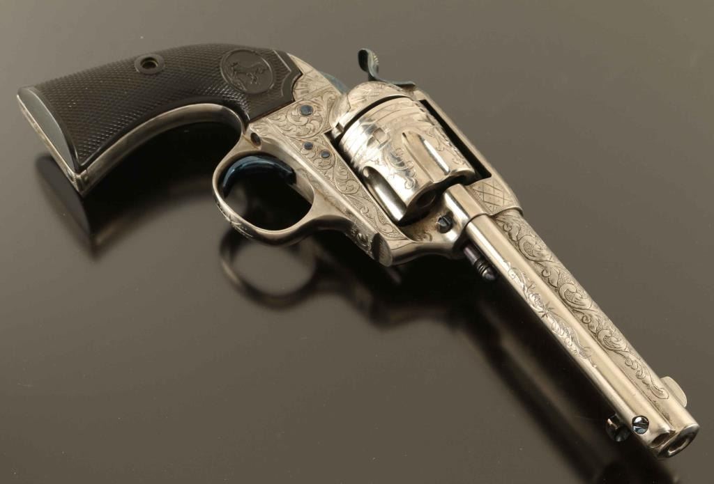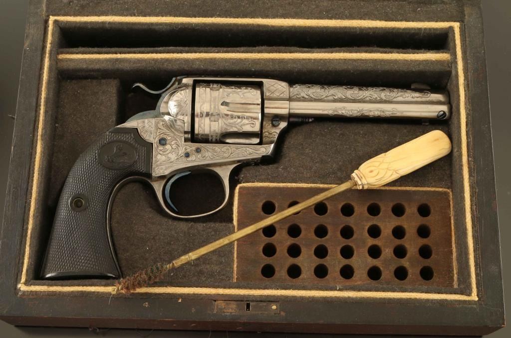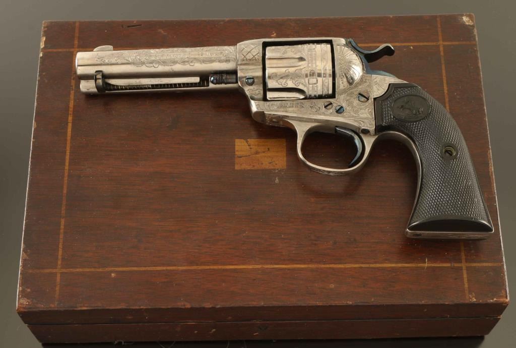 Engraved 1903 vintage single action revolver with finished in-the-white with niter blued small parts. 4 3/4" bbl with two-line address, shortened front sight, C coverage floral scroll engraving with zig-zags & fans, niter blued screws, ejector thumb piece, cylinder pin, trigger & hammer and two-piece checkered hard rubber grips. Serial numbers match on the frame, triggerguard and backstrap. Includes an antique wood presentation case with fitted interior, cartridge block and ivory handled cleaning rod. The markings are very good with "(BISLEY MODEL) 32 W.C.F." hand engraved on the barrel. Revolver exhibits sharp engraving with some light scattered pitting. Action is crisp with four clicks, the bore is good with some pitting and the hard rubber grips are very good. Condition is NRA Good+ as restored. ***C&R Firearm***