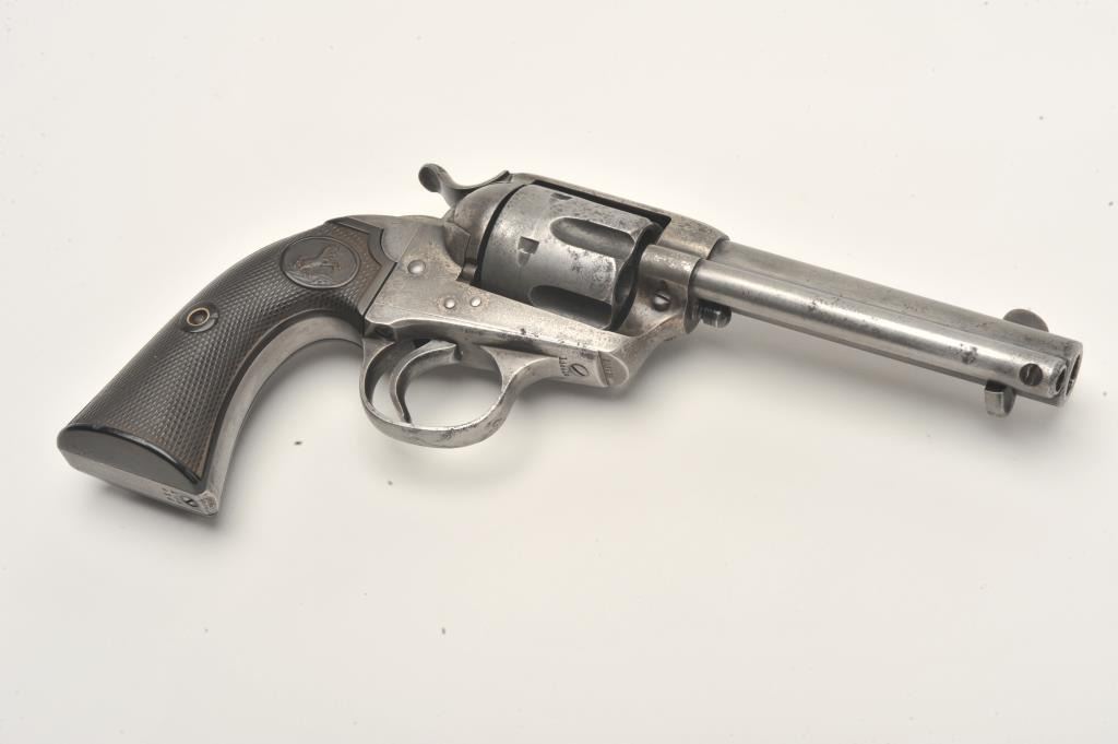Colt Bisley Model SAA revolver, .45 caliber, 4.75” barrel, blued and case hardened finish, checkered hard rubber grips, S/N 183916, in overall good condition showing a grey patina on metal surfaces with scattered spots oferosion and pinprick pitting, good action, good markings and overall good grips; bore is fair to good overall. Accompanied by a Colt factory letter confirming basic features with stocks “Not Listed”; shipped to Colt’sSan Francisco Agency, S.F., CA. on March 3, 1899, five guns in shipment. (C&R/No PPT). Est.: $1,250-$2,500.