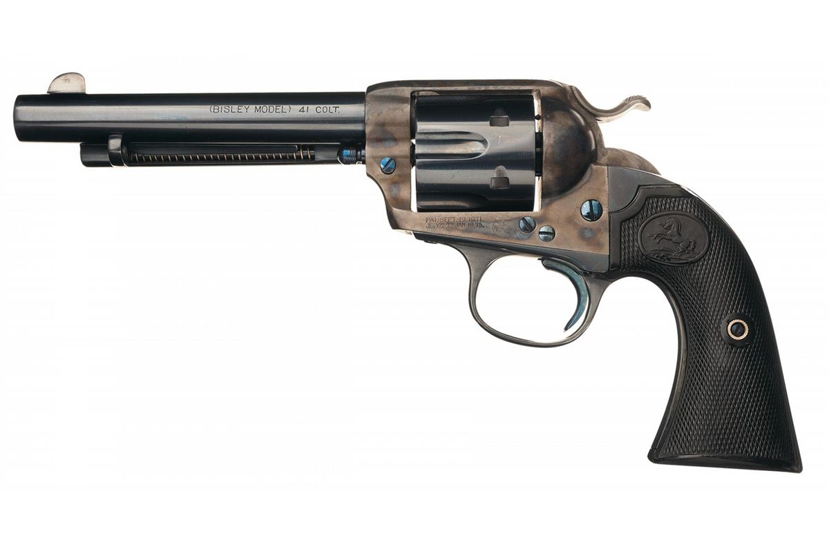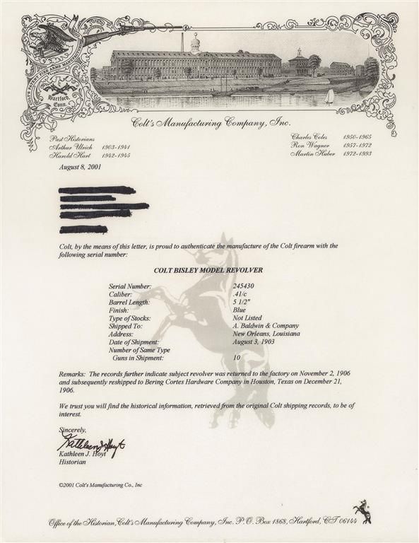 According to the factory records, this revolver was part of a 10-gun shipment to A. Baldwin & Company of New Orleans, Louisiana on August 3, 1903. The caliber, barrel and finish are confirmed by the letter, with the grips "Not Listed". Fixed sights, with the one line Hartford address on top of the barrel, "(BISLEY MODEL) 41 COLT" on the left side and the two line, three date patent marking on the left side of the frame followed by the circled Rampant Colt. The matching serial number is marked on the frame, trigger guard and back strap with the assembly number "2131" on the loading gate. With checkered hard rubber grips with the Rampant Colt in an oval at the top.