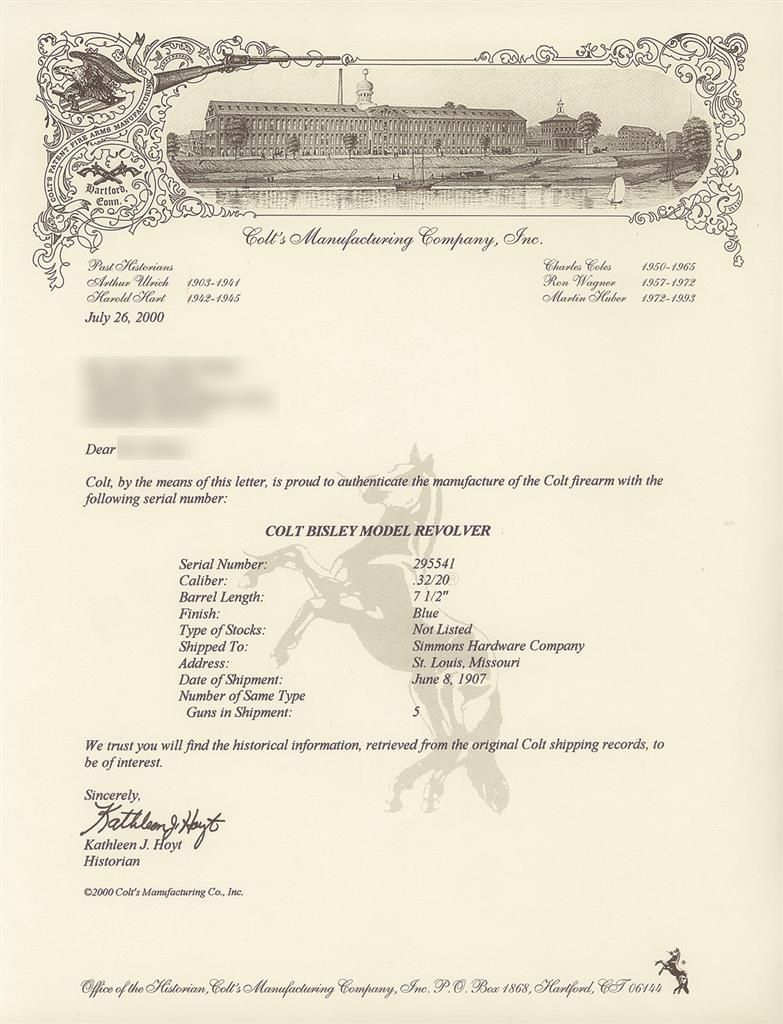 Manufactured in 1907. The factory letter states this revolver is a .32-20, has a 7 1/2 inch barrel, is blue and was shipped to Simmons Hardware Company of St. Louis, Missouri on June 8th, 1907.