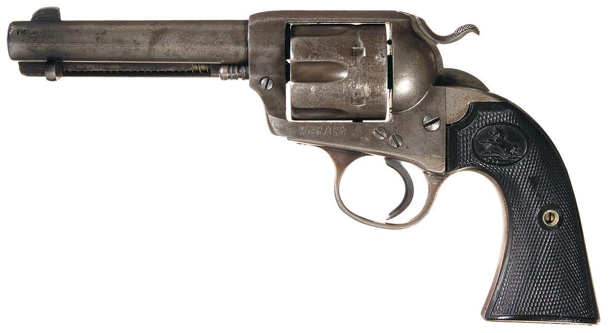 Manufactured in 1903. Standard features. Barrel markings are absent and the cylinder is a replacement numbered to another gun. Frame, trigger guard and grip strap numbers match. Left grip panel has a crack at the top.