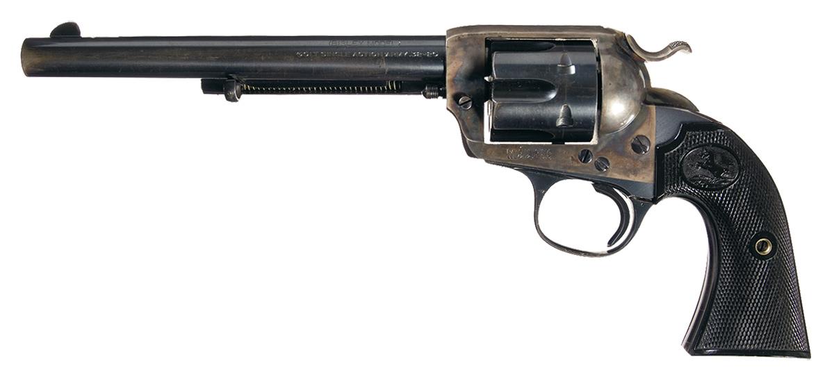 Manufactured in 1908. The top of the barrel is marked with the one line address, "(BISLEY MODEL) / COLT SINGLE ACTION ARMY 32-20" on the left side and the left side of the frame is marked with the two line, three patent dates followed by the Rampant Colt. The right rear of the trigger guard bow is marked with the number "6" and the Colt "VP" proof is on the left front, and matching serial number on the frame, trigger guard and backstrap. Blade front and frame notch rear sights and fitted with checkered hard rubber grips with the Rampant Colt in an oval at the top.
