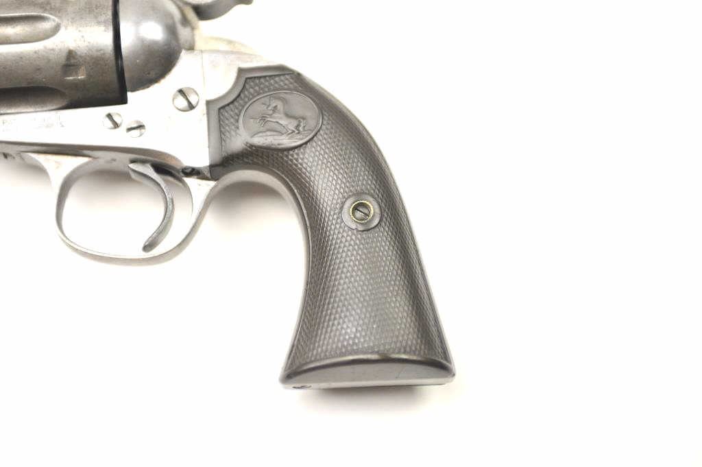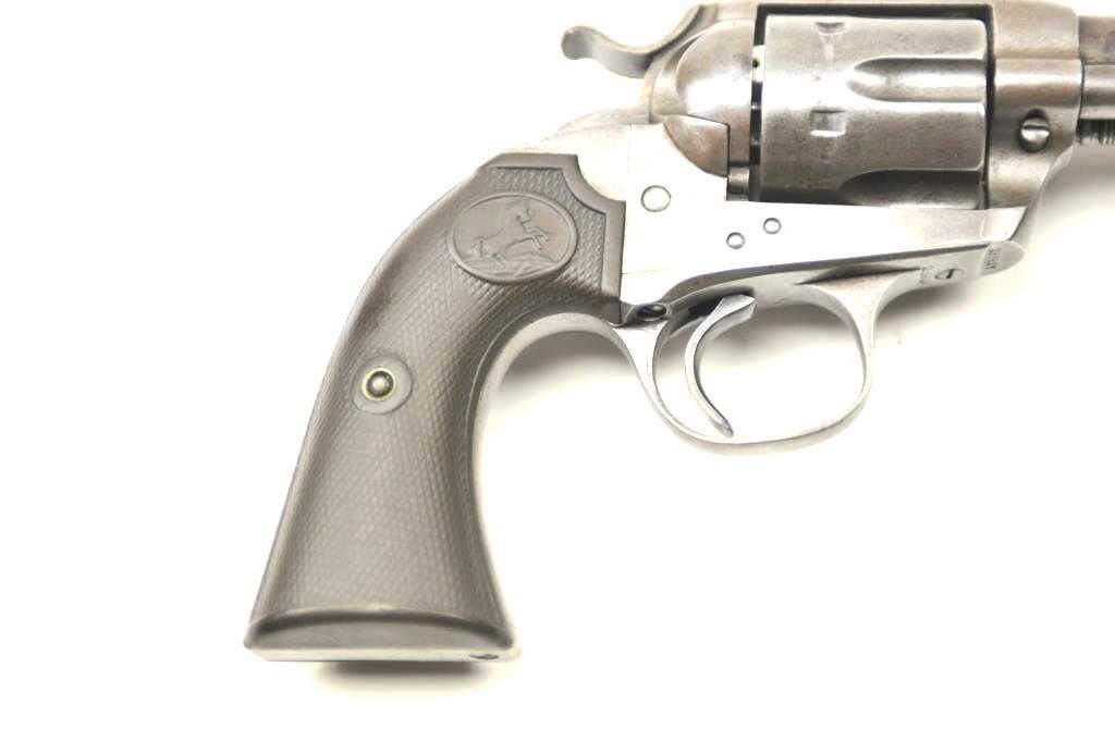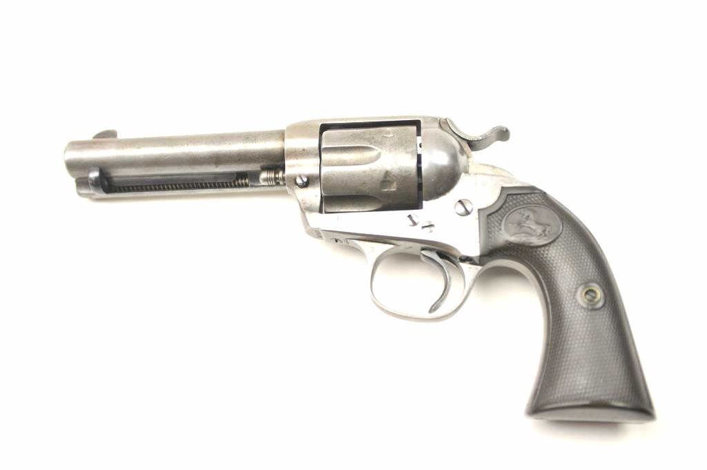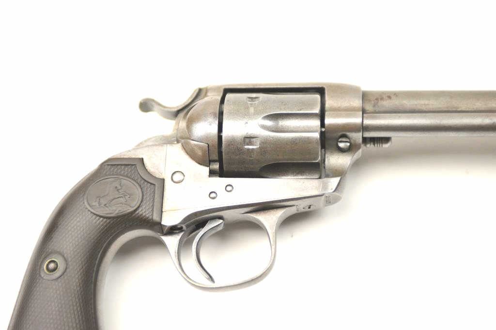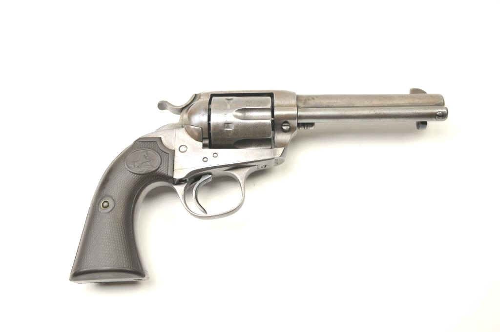 Colt Bisley Model Single Action Revolver with a 4 ¾” barrel in .32-20 caliber, S/N 288627. Lightly cleaned gray patina finish with traces of finish where protected. Markings are all visible but light on the barrel andmatching. The grips are good and fit impeccably (Originals). The front sight has been slimmed slightly and good action with fair to good bore. C&R/PPT) Est.: $700-$1400