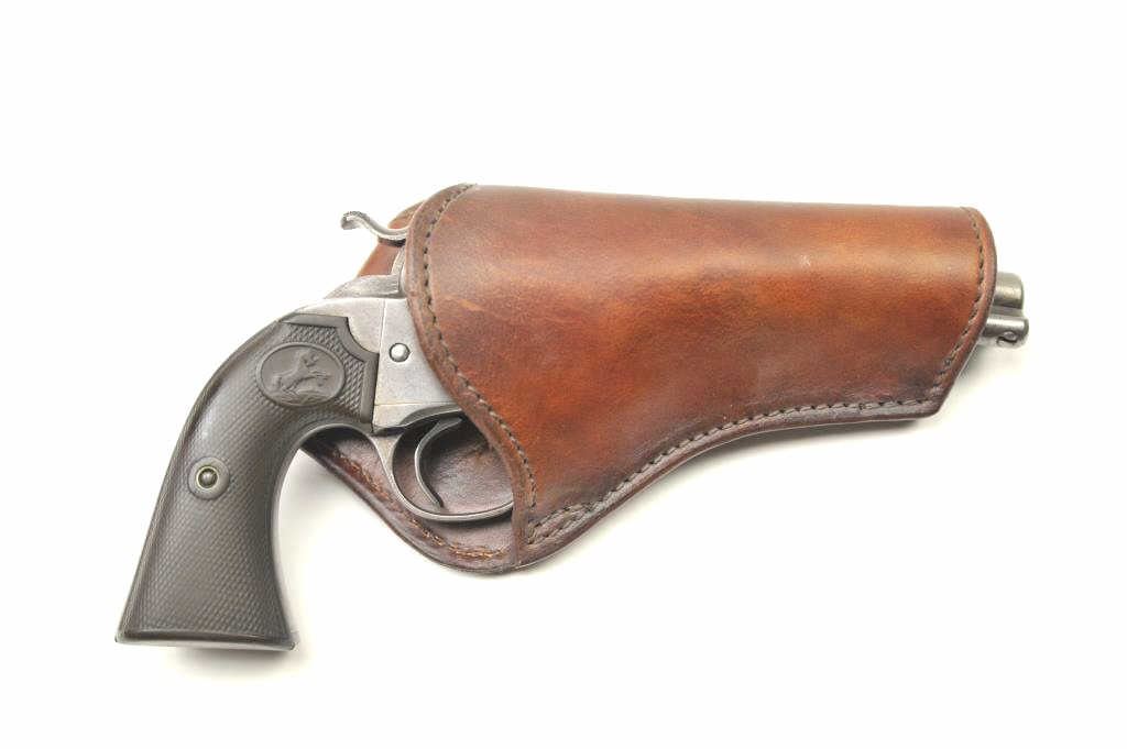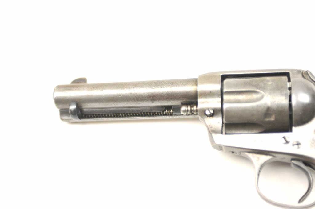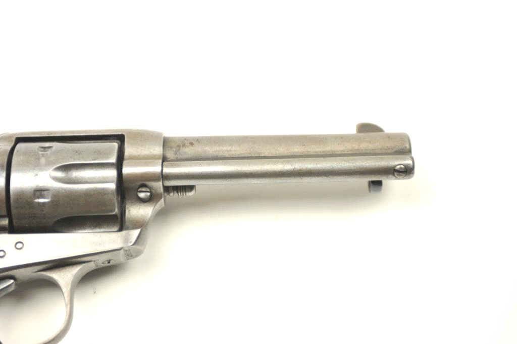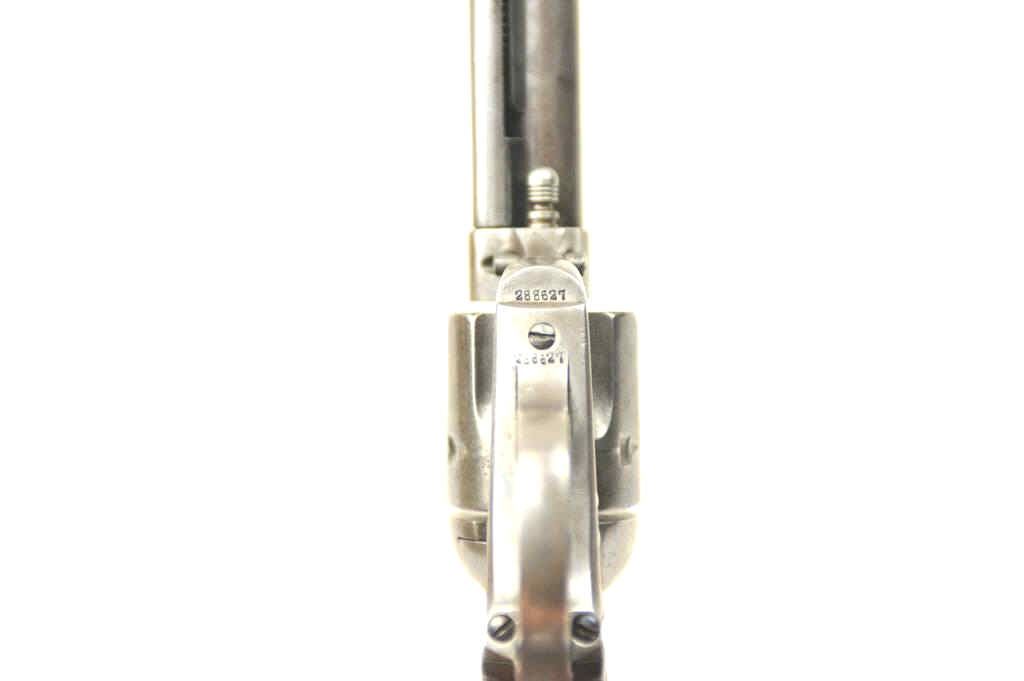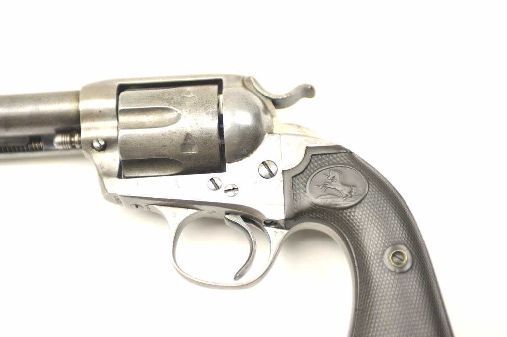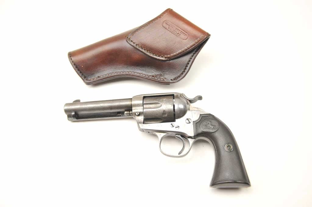 Colt Bisley Model Single Action Revolver with a 4 ¾” barrel in .32-20 caliber, S/N 288627. Lightly cleaned gray patina finish with traces of finish where protected. Markings are all visible but light on the barrel andmatching. The grips are good and fit impeccably (Originals). The front sight has been slimmed slightly and good action with fair to good bore. C&R/PPT) Est.: $700-$1400