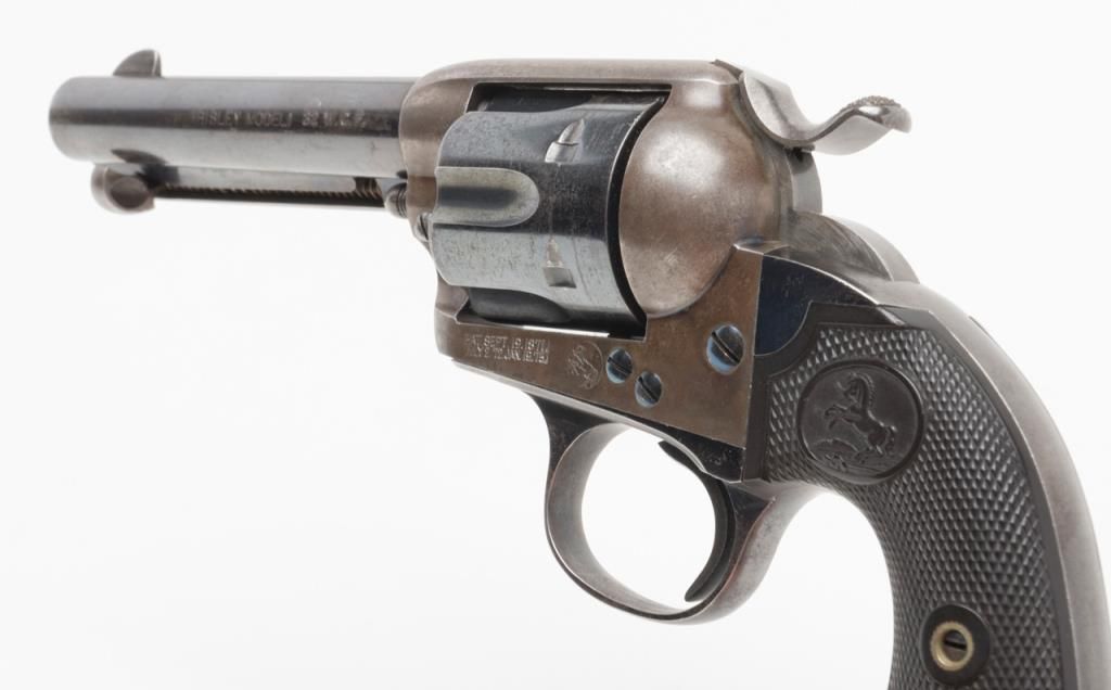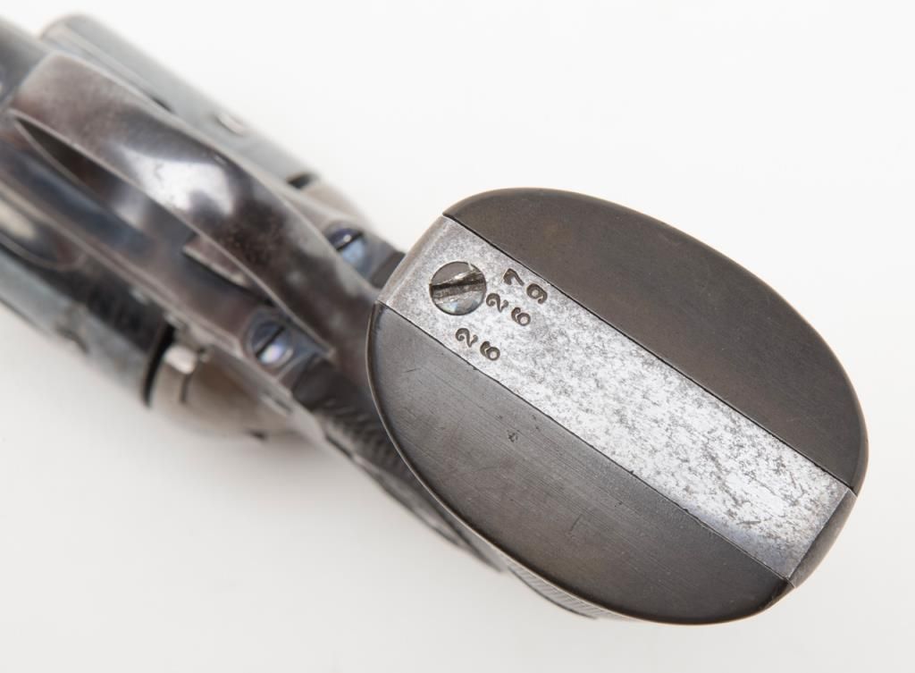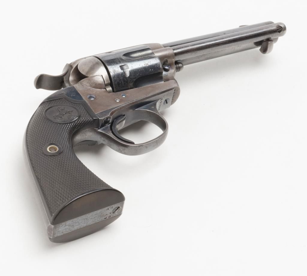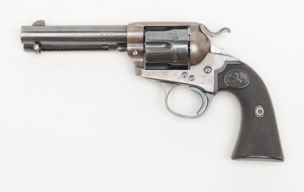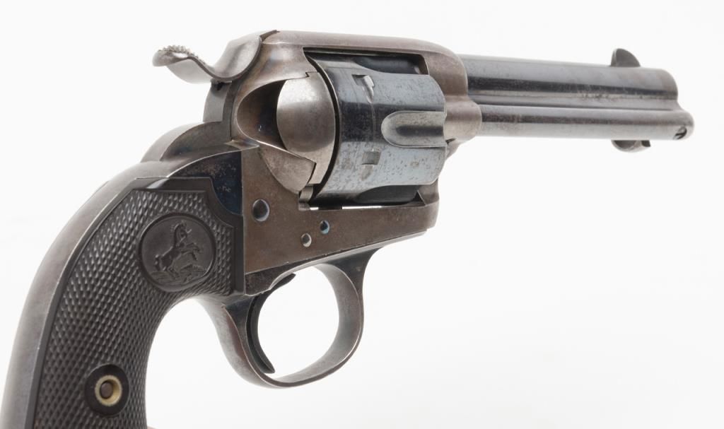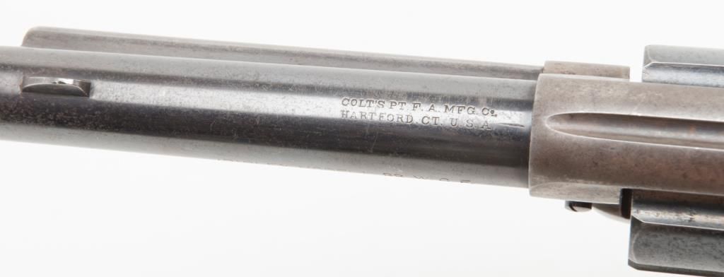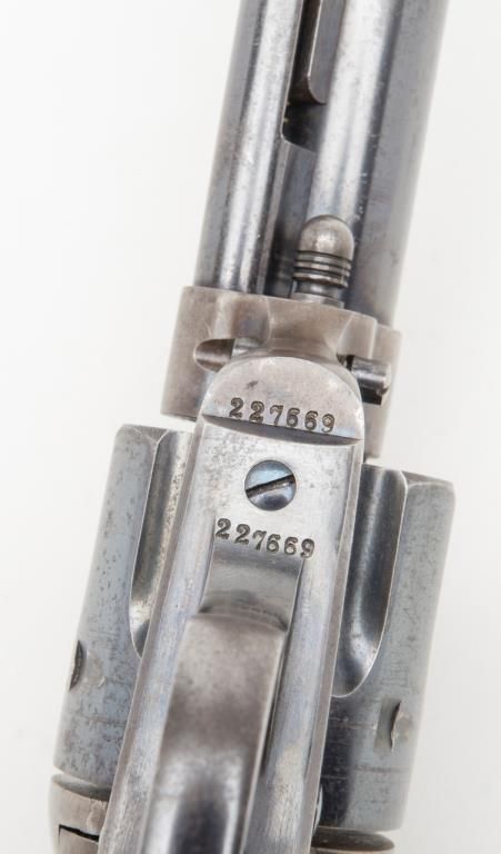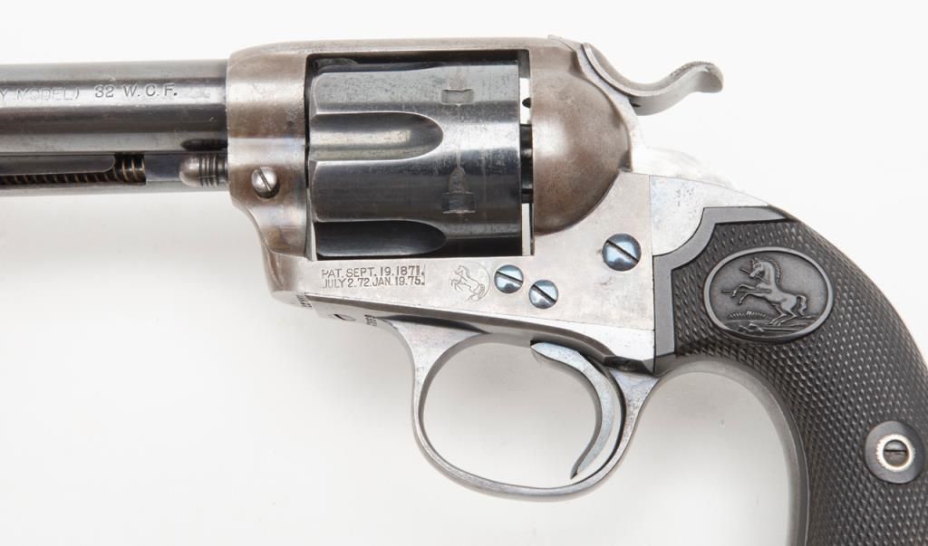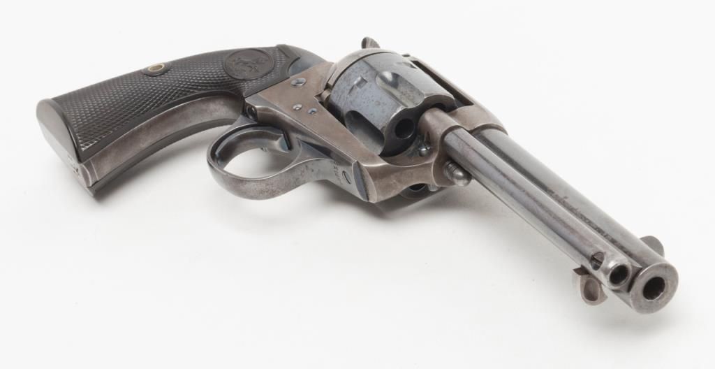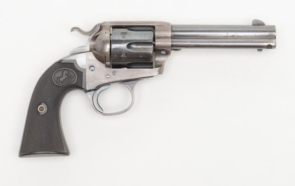 Colt Bisley Model Single Action revolver, .32 W.C.F. cal., 4-3/4” barrel, blue and case hardened finish, checkered hard rubber grips, #227669 (circa 1902) in overall very good + to fine condition, approx. 75%-85% blue, 40%-50% caseturning to smoky patina with traces of colors, very good grips, good action, good bore, front sight reduced slightly. All matching numbers and a nice gun. (C&R). Est.: $2,000-$4,000.