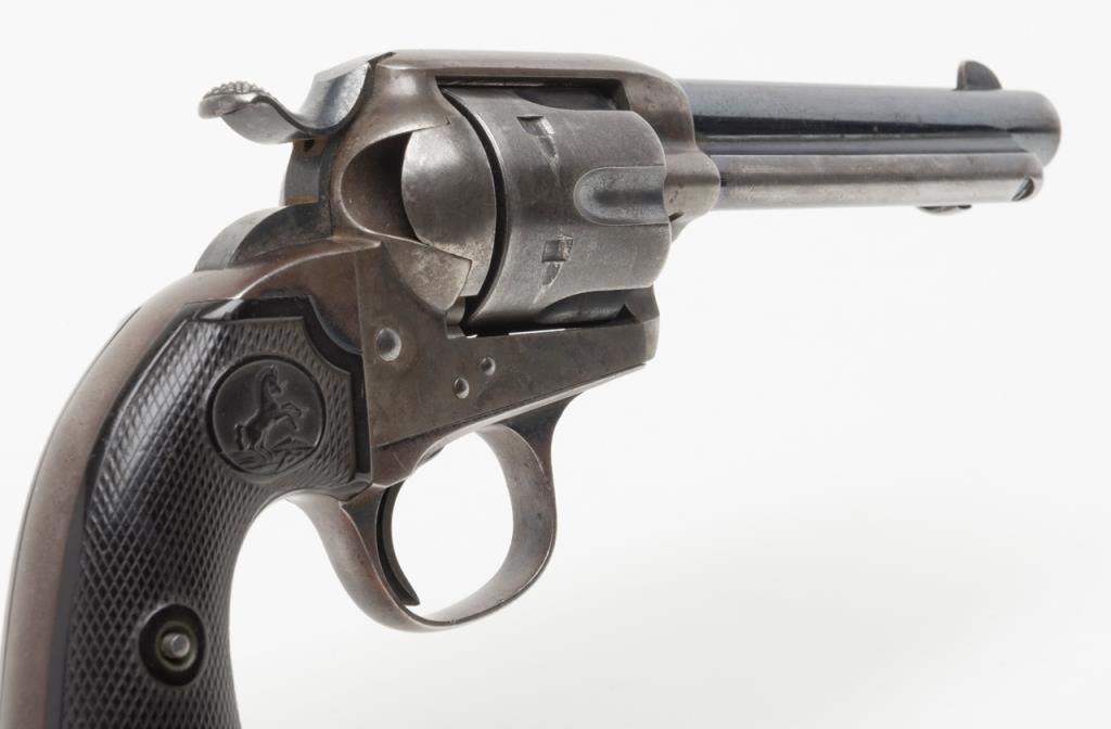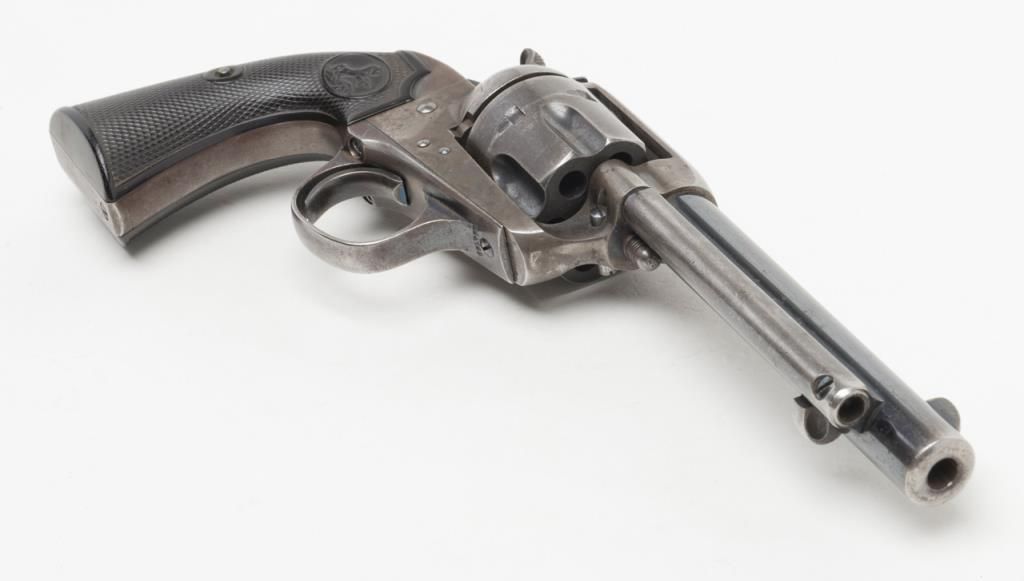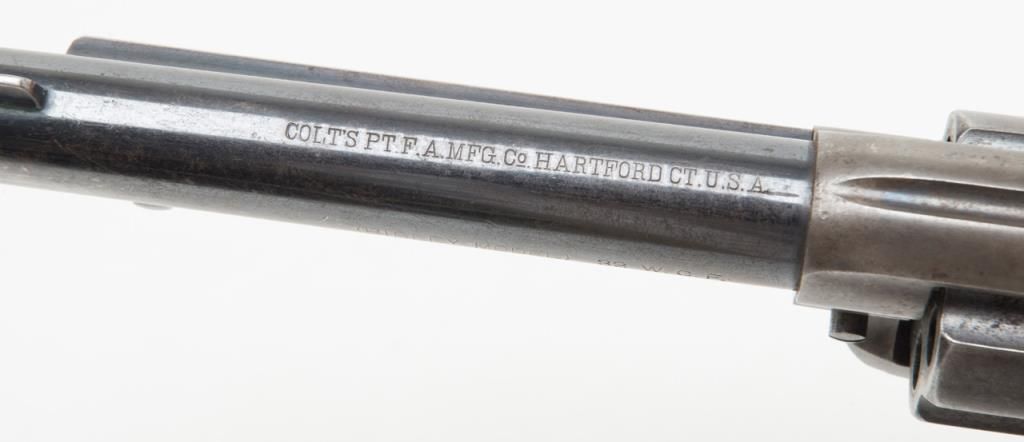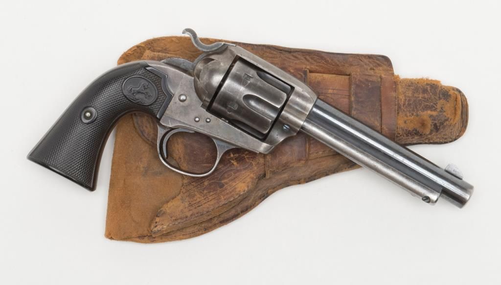 Colt Bisley Model Single Action revolver, .32 W.C.F. cal., 5-1/2” barrel, blue and case hardened finish, checkered hard rubber grips, #284703 in overall very good to near fine condition showing approx. 65% original blue finish with most of that blue on the barrel being bright; approx. 30% original case colors on the frame with balance gone to a silvery tone, good bore, crisp action, sharp markings and very good grips. The gun is accompanied by a well-worn stock double loopWestern style leather holster that appears to have been with this gun for many years; a great looking rig! (C&R). Est.: $800-$1,600.