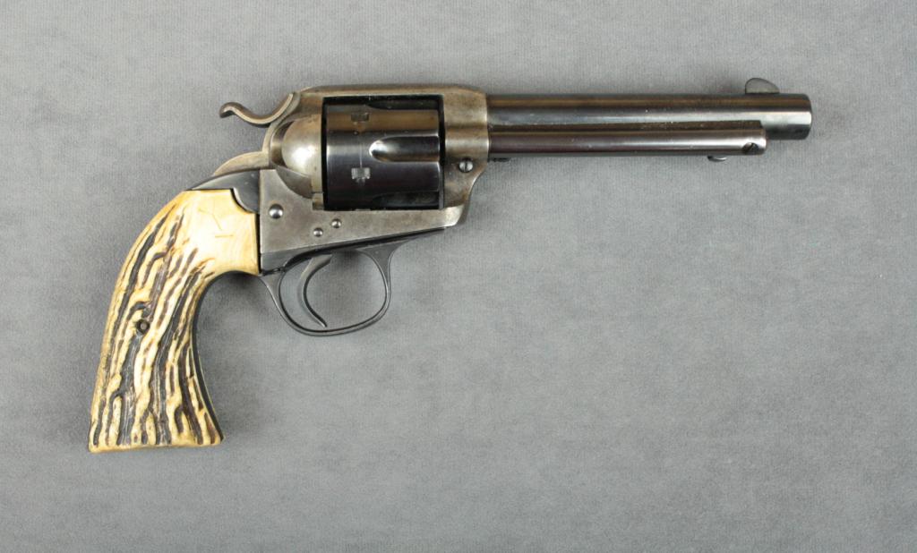 Colt Bisley Model Single Action revolver, .32 WCF cal., 5-1/2” barrel, blue and case hardened finish, stag grips, #292639. This gun is in overall good to very good condition showing the majority of an old re-bluefinish to the barrel assembly, cylinder and straps, traces of original case colors on the frame, crisp action, good bore, matching visible serial numbers, very good stag grips with “B2” on the left side grip and lineunder Y on the right grip, likely a ranch brand. Est.: $1,500-$2,500.