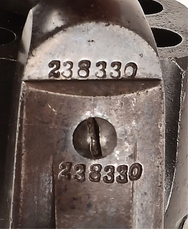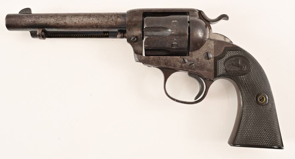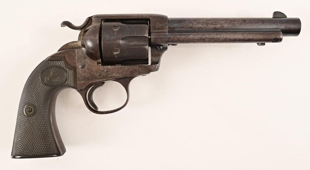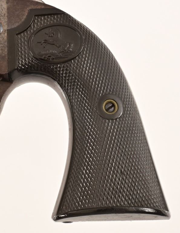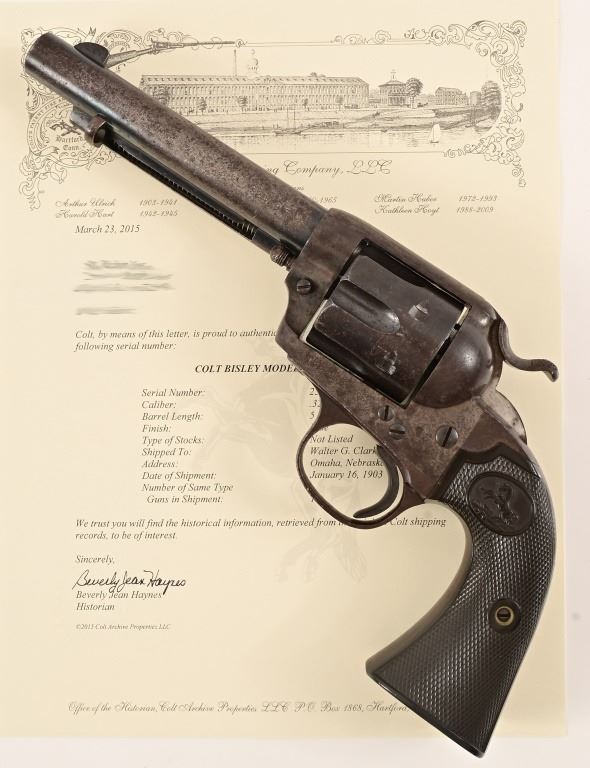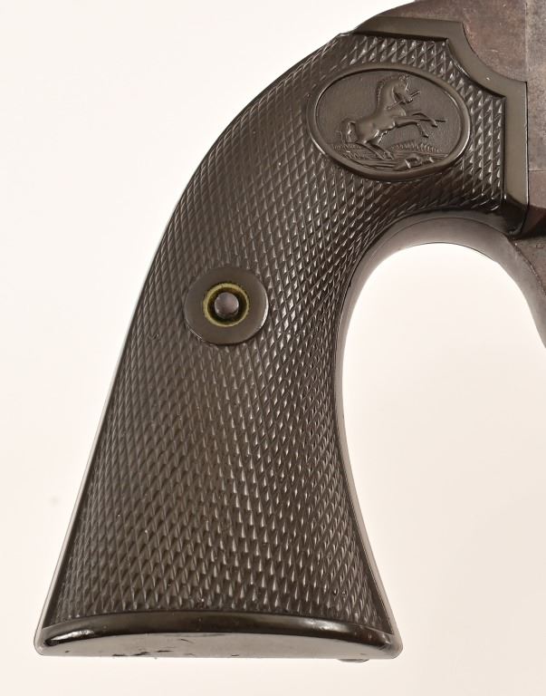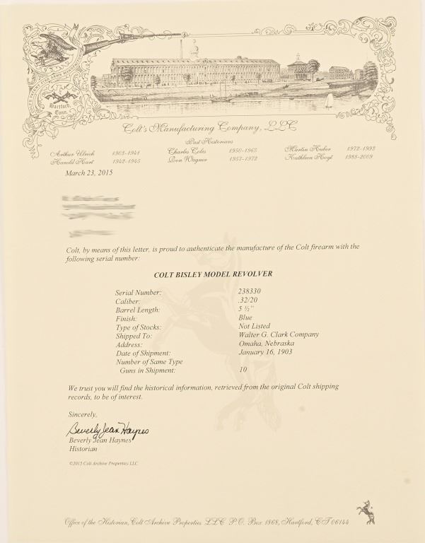 S/N 238330. Blue finish, rampant colt checkered rubber grips, 5.5" barrel. Factory letter shows part of 10 gun shipment to Walter G. Clark Company, Omaha, Nebraska on January 16, 1903.