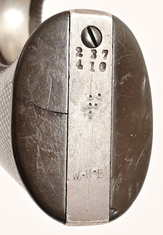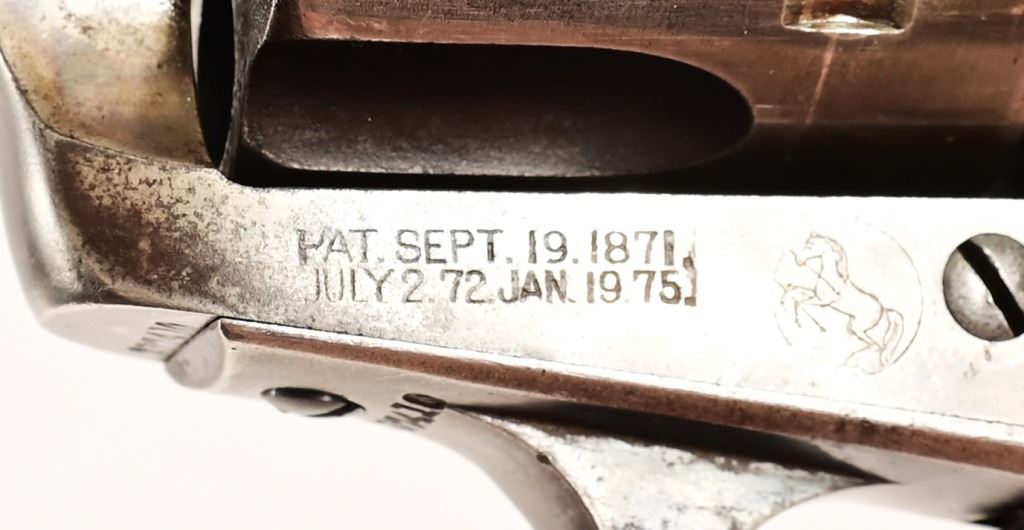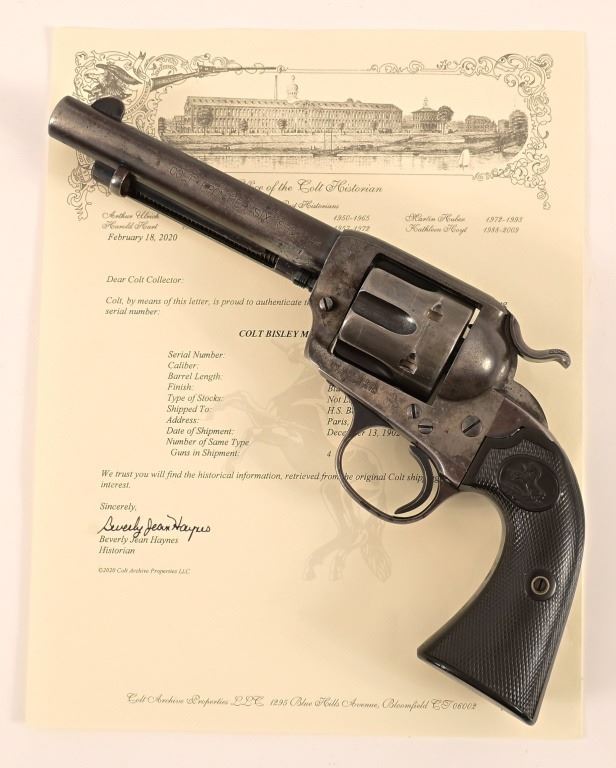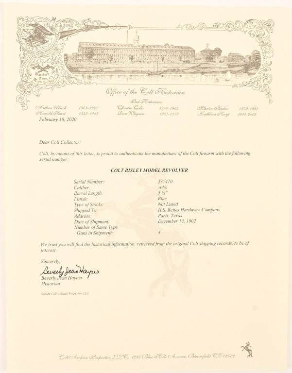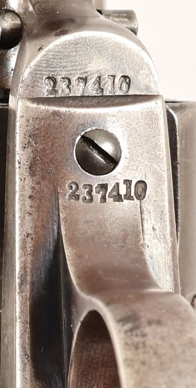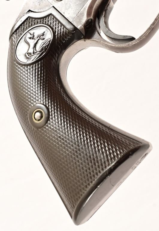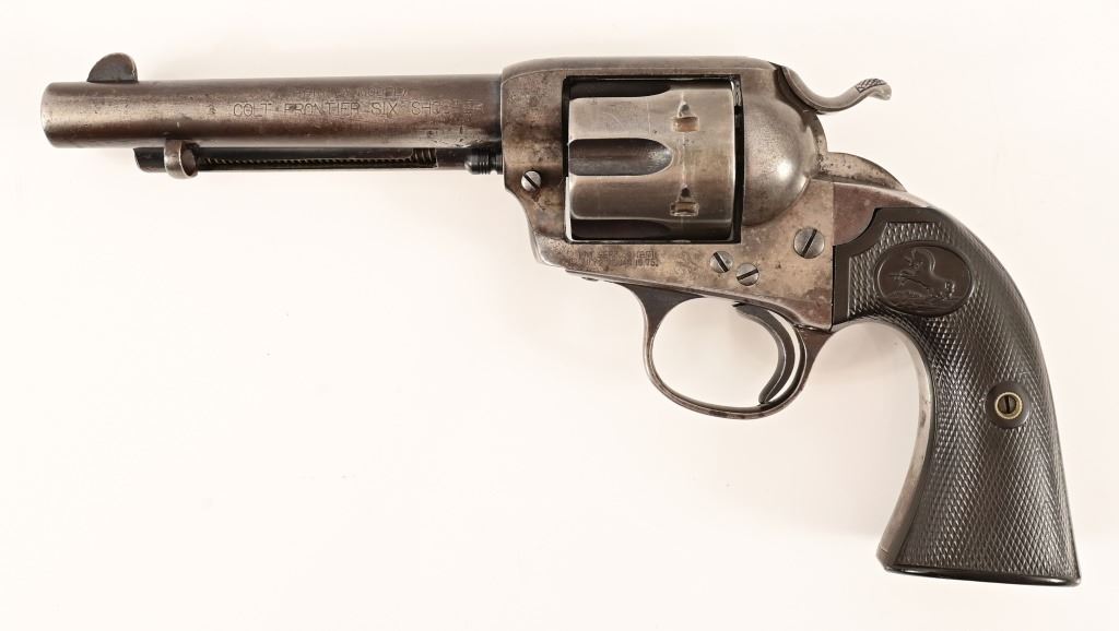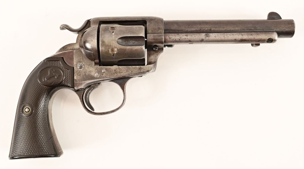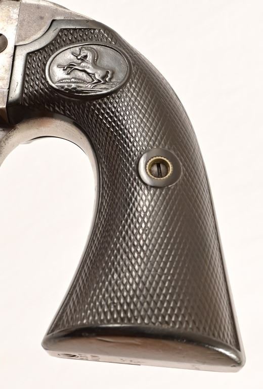 5.5" barrel, blue finish, rampant colt checkered grips. S/N 237410, factory letter shows shipment December 13, 1902 to H.S. Bettes Hardware Company, Paris, Texas. Butt is stamped with initials "W.H.B."