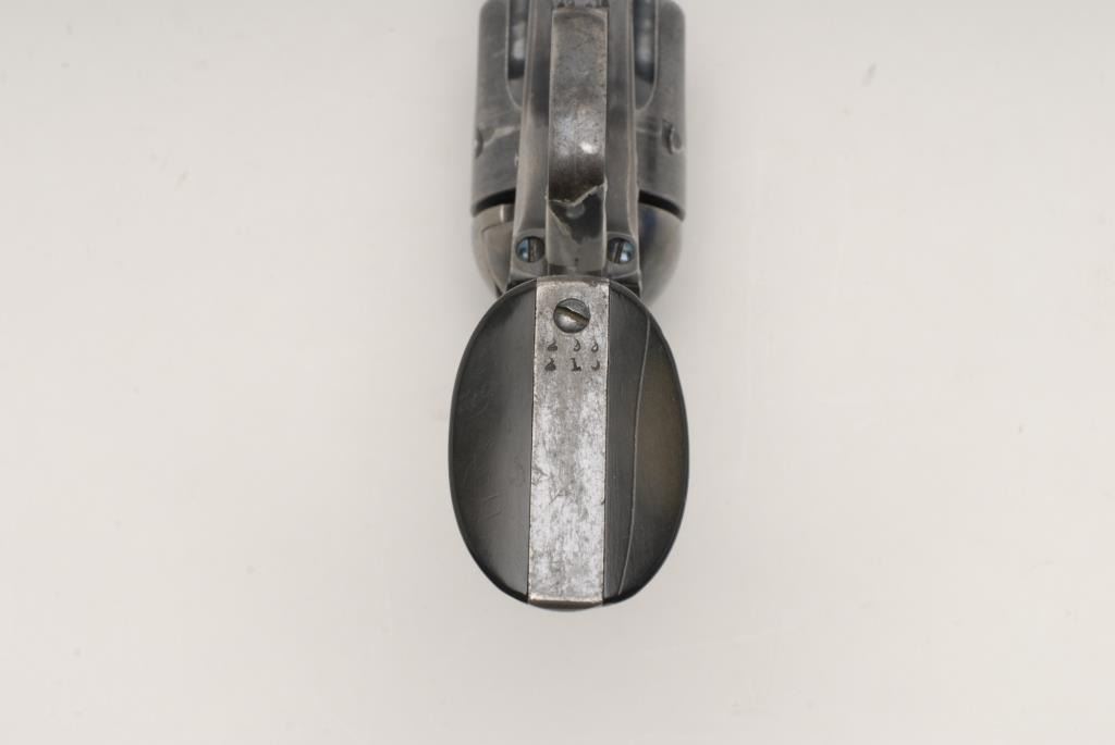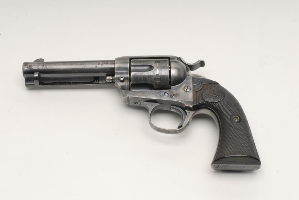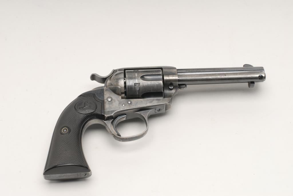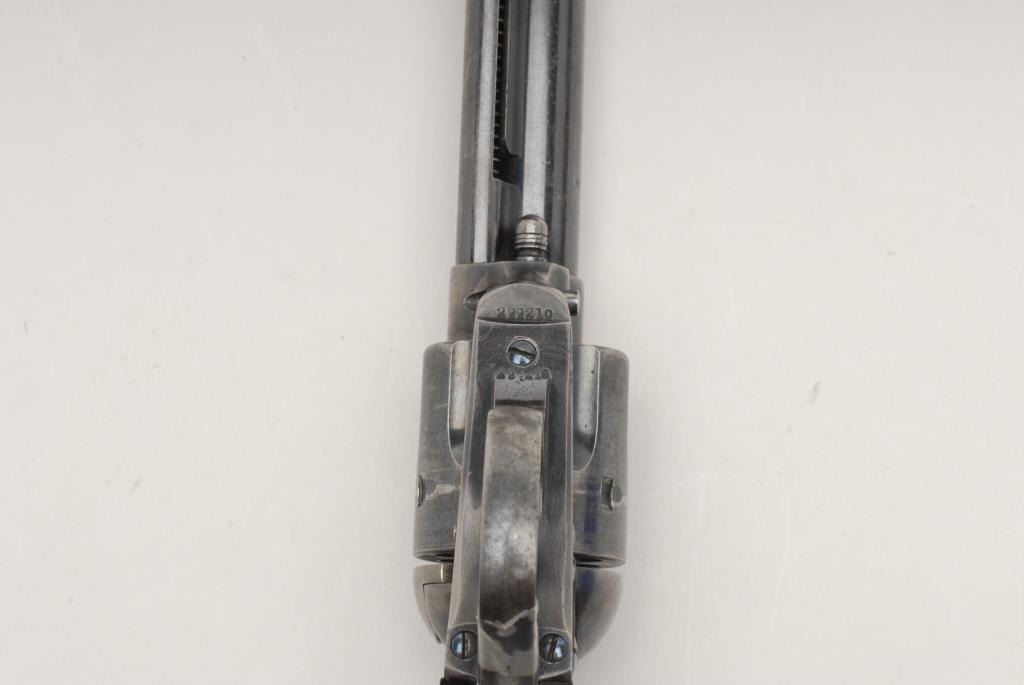 Colt Bisley Single Action Revolver, .32 W.C.F. caliber, 4 ¾” barrel, blue and case hardened, checkered hard rubber grips, S/N 299210. This revolver remains in good to very good condition showing approximately 40%-50% blue remaining along with mottled case colors on the frame. There are scattered areas of pitting and erosion most of which is toward the muzzle on the left side. Some of the screws have been buggered but stillretained some of their niter blue finish. The grips remain in very good condition with some scratches from use. The markings are sharp, the action is crisp and the bore is very good. Accompanied by a factory letterconfirming all features with stocks “Not Listed”; shipped to Hibbard, Spencer, Bartlett & Company; September 11, 1907; 10 guns in shipment. (C&R/PPT) Est.: $1400-$2800