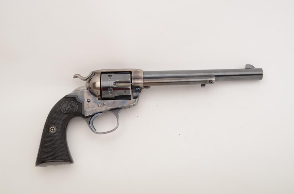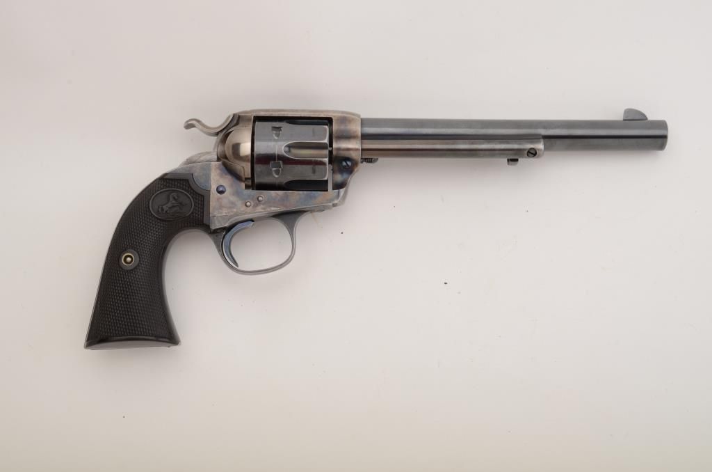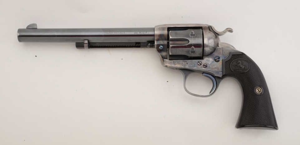 Colt Bisley Single Action revolver, .32 WCF cal., 7-1/2” barrel, blue and case hardened finish, checkered hard rubber grips, #317606. This gun is in overall fine to excellent condition showing approx. 95% original blueon the barrel, cylinder and straps with approx. 90% original case colors on the frame, fine bore, crisp action, sharp markings and fine grips. Est.: $1,800-$3,600.