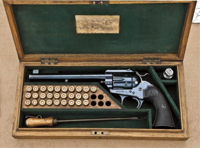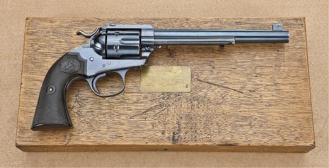 Colt Bisley model flat top target model single-action revolver, .38-40 caliber, 7-1/2” barrel, factory blue finish, hard-rubber grips, serial #310410 in English style partition case with London agency label in lid. One of approx. 98 made in this caliber. The pistol remains in near-fine original condition with 85-95% original blue thinning at the muzzle and gripping areas and edges of cylinder. The pistol shows a few scratches and a minor index line between the cylinder stops. The markings are sharp, the edges are crisp, the blue is still bright. The grips are very good plus to near fine. The hammer shows 60-80% case hardening. The action is tight, the bore is near excellent. All matching visible serial numbers. The pistol is contained in a green baise lined partition case which is in very good condition showing just some fraying and indentations, normal aging. The case contains a rod, key, and oiler. The label in lid shows Glass House street address and label shows just some staining. The exterior of the case is oak with brass mounts. The case is good with some light cleaning, dents, impressions, and normal aging. The pistol shows no British proofs. From the