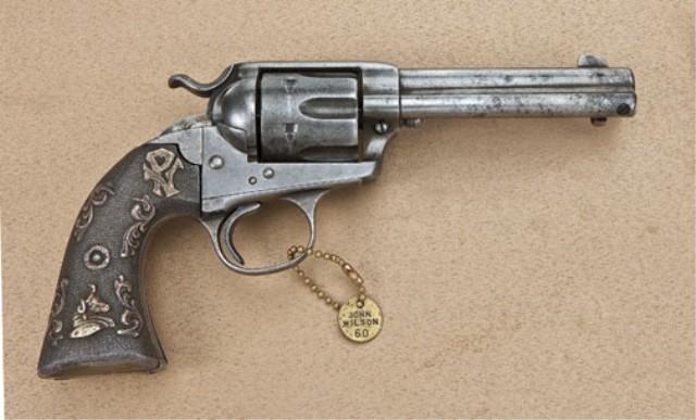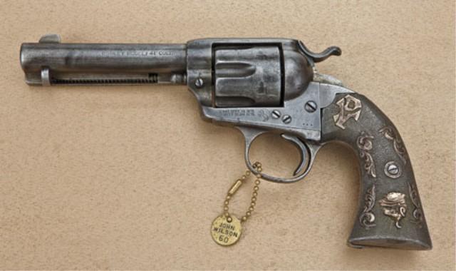Colt Bisley model revolver, .41 Colt caliber, 4-3/4” barrel, brown patina finish, finely made cast-silver and gold grips with initials “PV” at the top of each grip, serial #217331. The pistol shows an even grey to brown patina finish, with some erosion, pinprick pitting, some slightly heavier pitting on the front ejector rod housing. The markings are good, the action is good, the bore is very good. All matching serial numbers. A collection tag is attached to trigger guard, John Wilson #60. John Wilson was a well-known collector who’s family ran ranches in Texas and New Mexico since the early frontier days. Mr. Wilson’s father and grandfather collected guns, and the family knew Poncho Villa, and Pat Garrett, and their paths crossed with some of the legends of the West. We had occasion to sell several hundred arms from this collection more than a decade ago in which this pistol was included. Mr. Wilson had several Villa guns that he obtained by decent and from Mexican government officials he knew. There is no paperwork or documentation, however these grips are exceptional and were made for someone of importance. The quality of the gold work is very good, and the PV and bull’s head are significant.