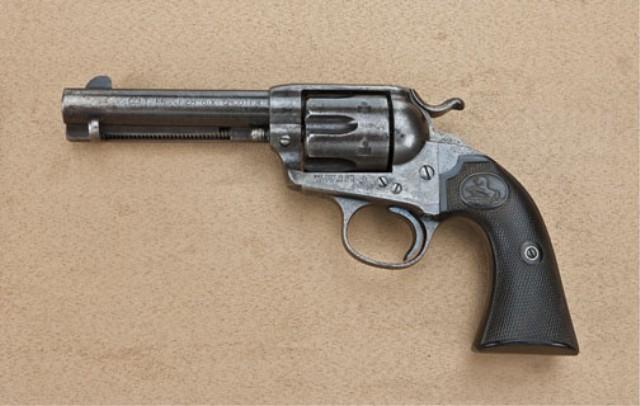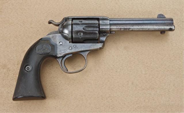 Colt Bisley revolver, .44-40 caliber, blue and case hardened finish, hard rubber grips, serial #203098. The pistol remains in original good to very good condition showing 30-50% original blue and case hardening, some scattered light erosion and pinprick pitting and normal aging. The barrel shows Bisley model, Colt frontier 6-shooter marking, the edges are good, the markings are sharp. The front sight is slimmed just a tiny bit on the edge. There is some bright blue and case hardening where protected. The grips are very good showing edge wear and fit perfectly. The action is tight, the bore is good to very good and may clean. An old collection tag is attached, John Wilson #18. John Wilson was a well-known collector whose family ran ranches in Texas and New Mexico since the early frontier days. He acquired guns from many Western personalities as did his forefathers and many of his guns that we have sold have lettered to Western shipments. Est: $1,250 - 2500