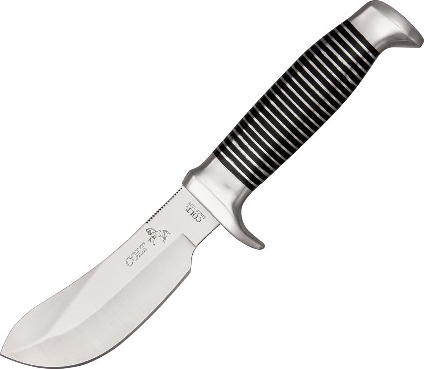 9 1/2" overall. 4 5/8" stainless skinner blade. Stacked aluminum and black synthetic handle with nickel silver guard and aluminum pommel. Black nylon belt sheath with suede trim. $40 MSRP